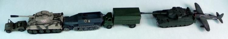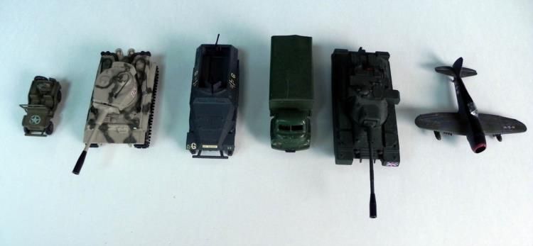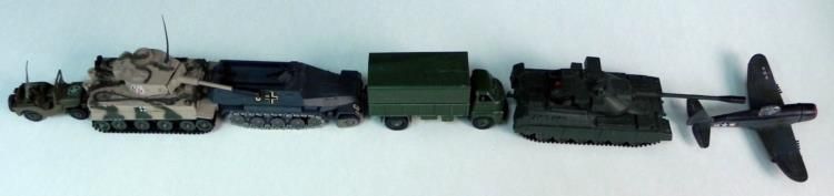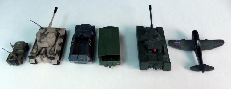 6 VINTAGE MILITARY WWII VEHICLES & PLANE-DIE CAST---TANK-PLANE-TRUCK JEEP-GERMAN CAMO TANK-SMALL JEEP-NAZI JEEP TRACK & WHEELS-5 IN ON TANK (US) 5" WINGSPAN ON PLANE-OTHERS SMALLER