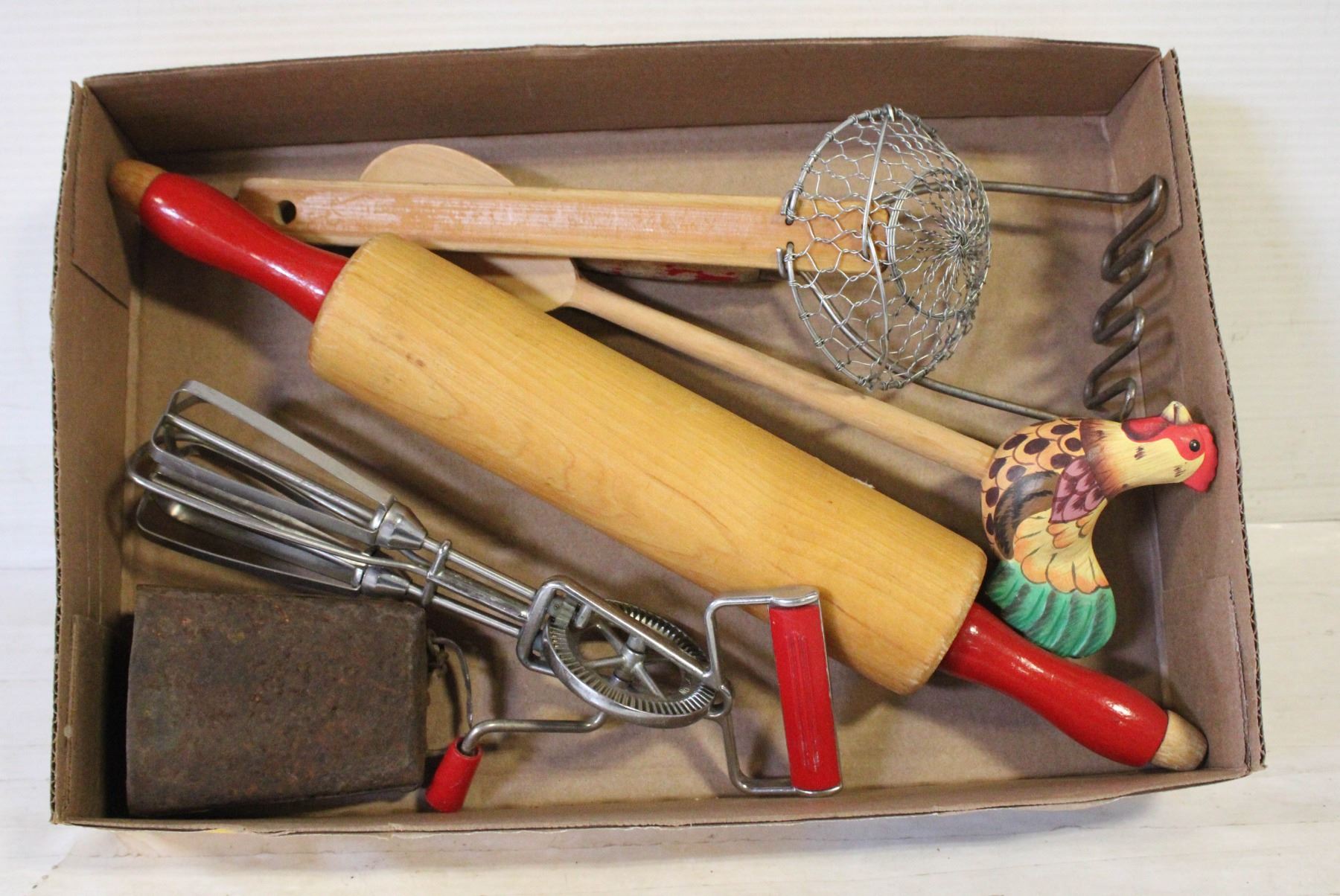(6) VINTAGE SHEEP BELL, BLENDER, ROLLING PIN,