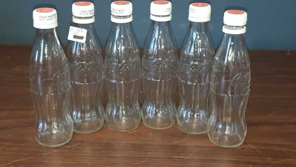 6 VINTAGE STUBBY COKE BOTTLES WITH CAPS