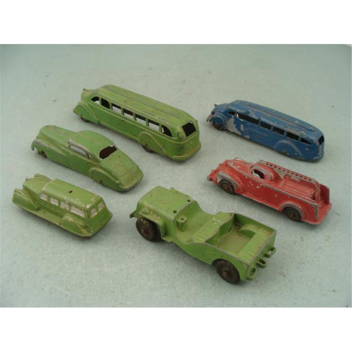 6 VINTAGE TOY VEHICLES-CAST AND RUBBER--SUN, TOOTSIETOY & MANOIL * INCLUDED: 3 1/2" SUN RUBBER(530-26) TRUCK---7" METAL MASTERS BUS---4 1/2" MANOIL #709 CAST FIRE TRUCK---TOOTSIETOY CAST JEEP 4 3/4"---6" BLUE TOOTSIETOY CAST GREYHOUND BUS---6" TOOTSIETOY AOTO-COUPE *