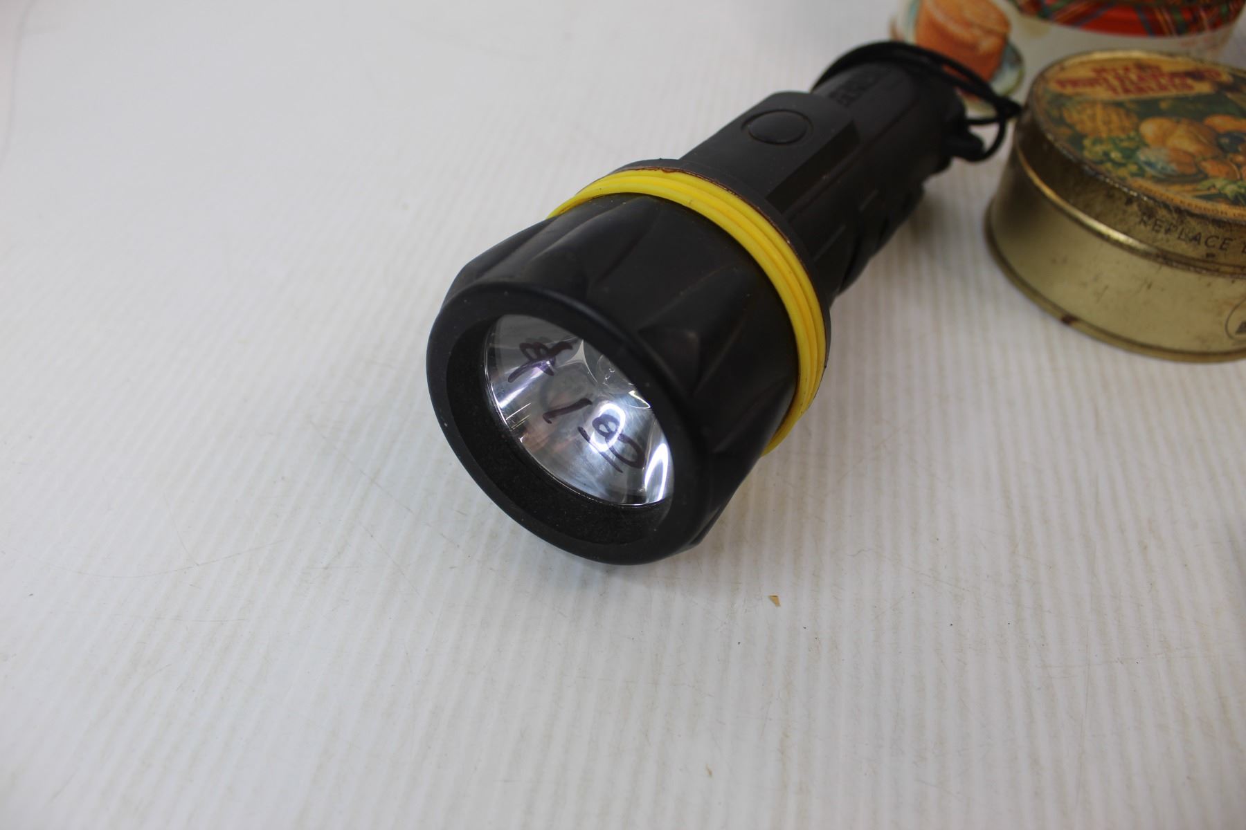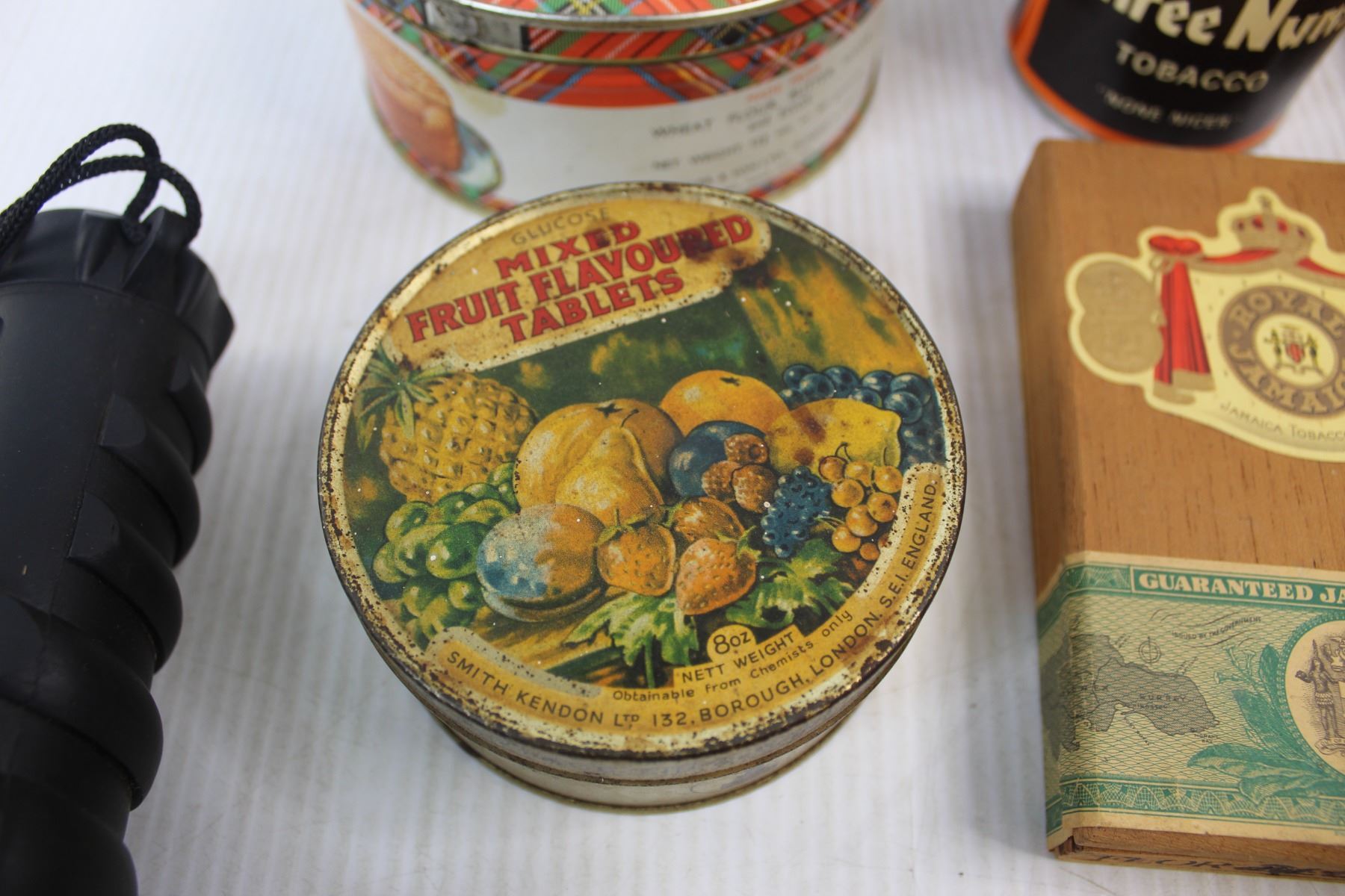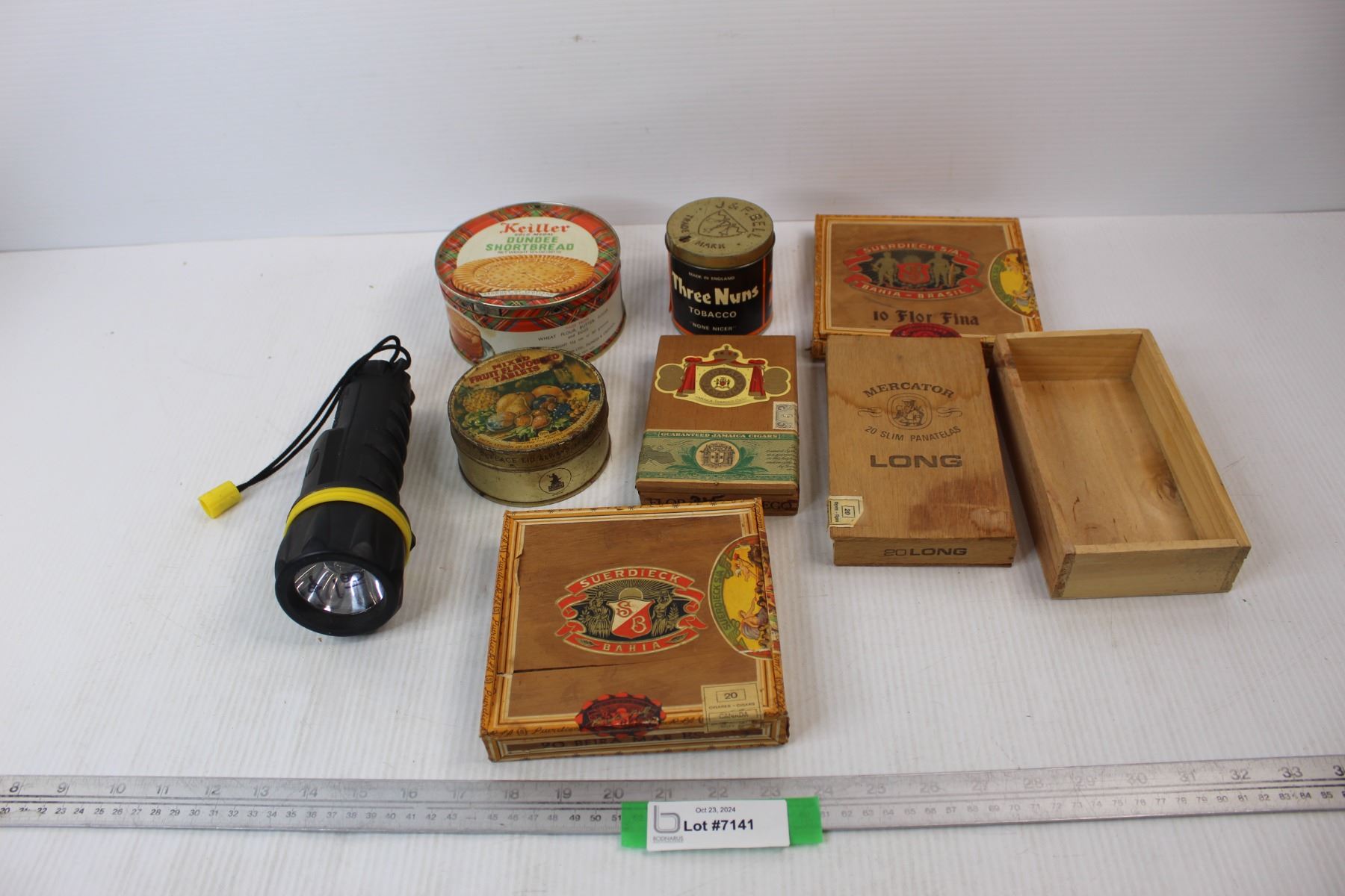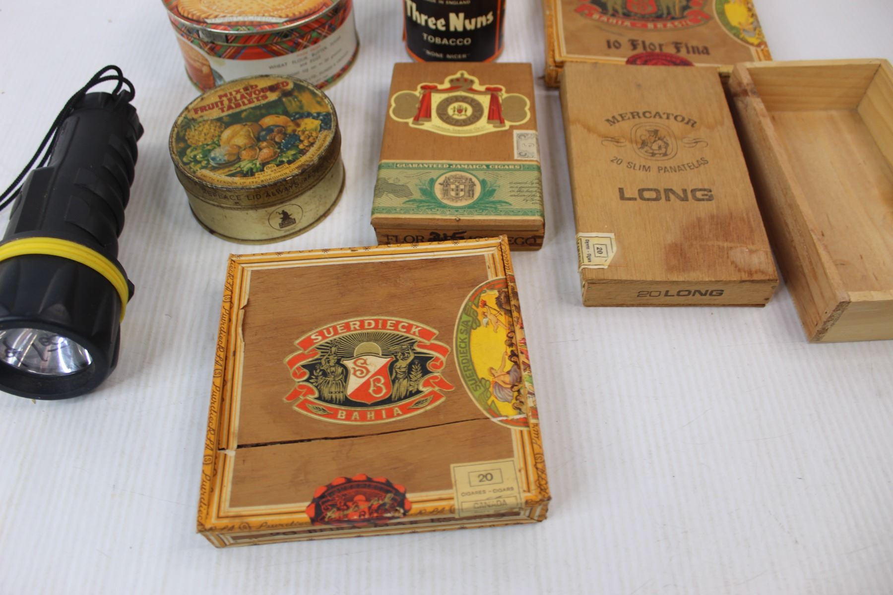 (6) Various Tins/ Cigar Boxes- (1) Is Damaged , Greatlite Flash Light- Powers on
