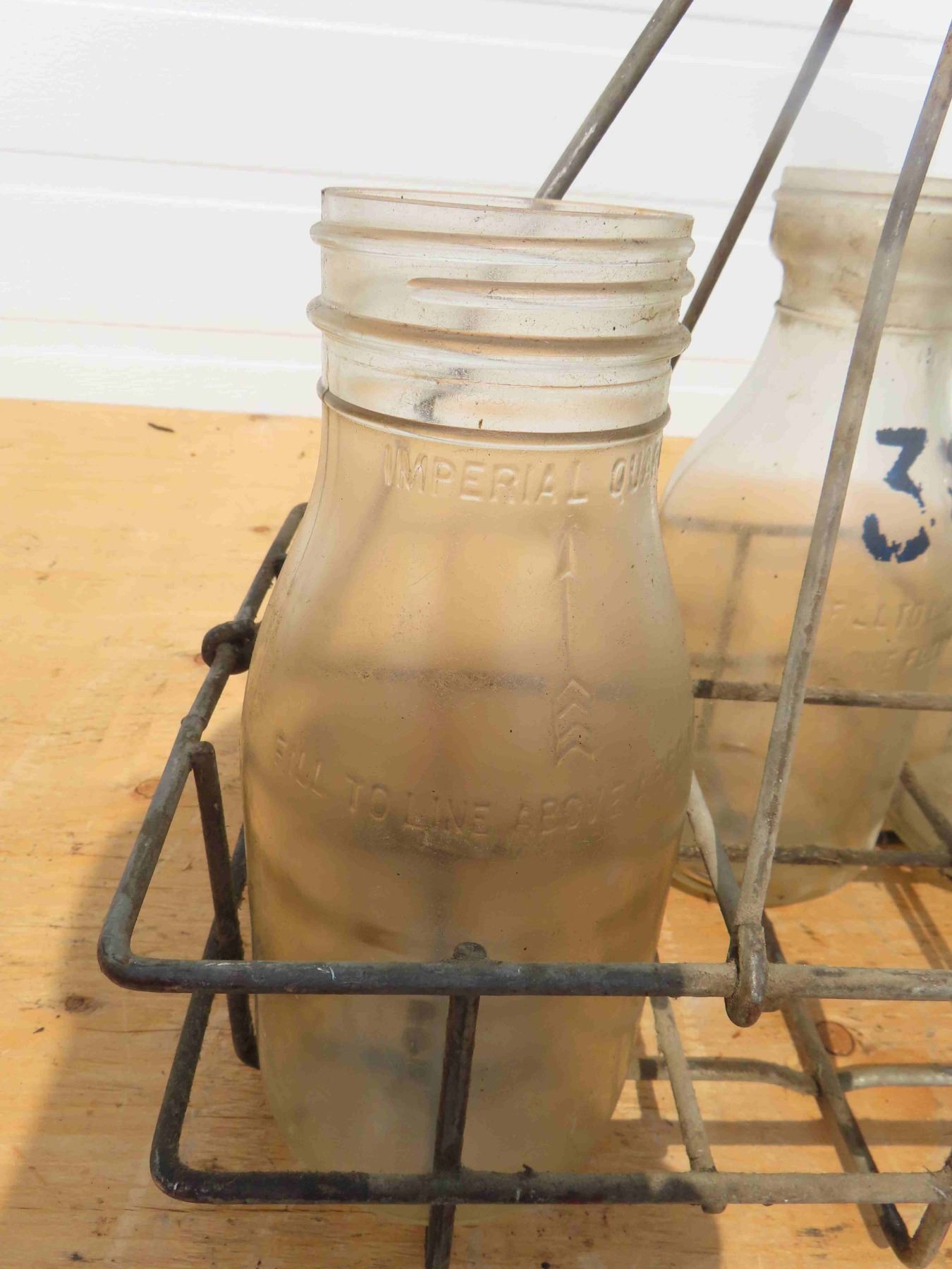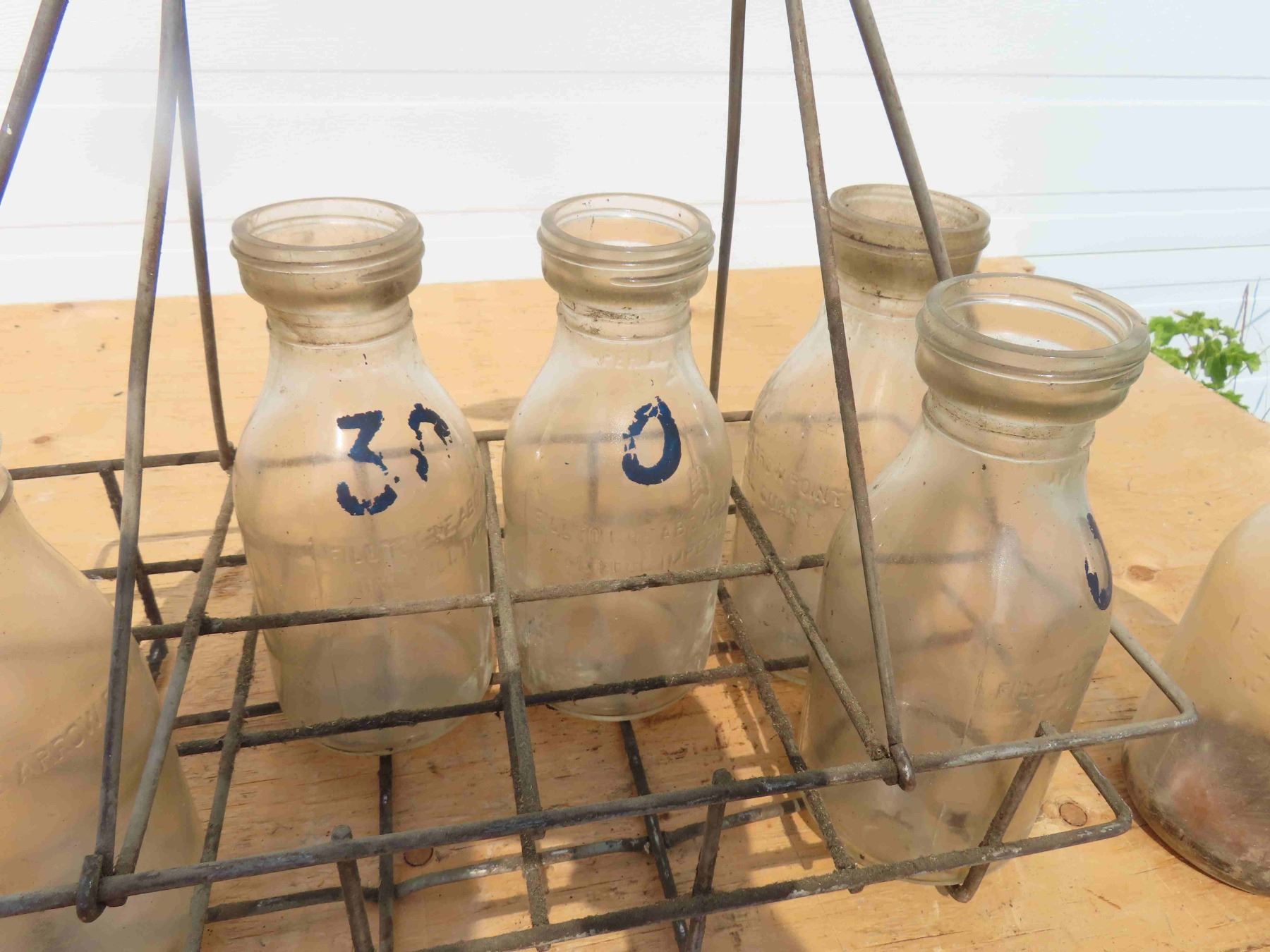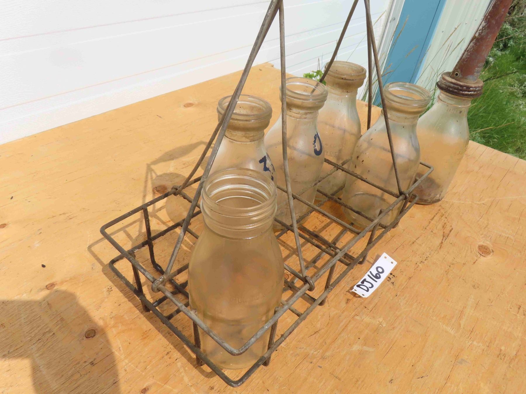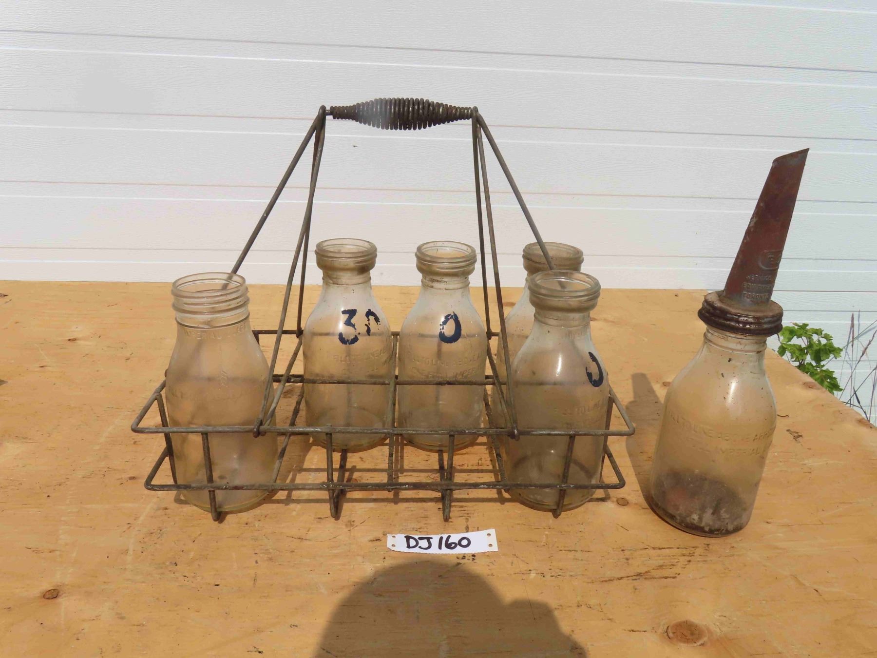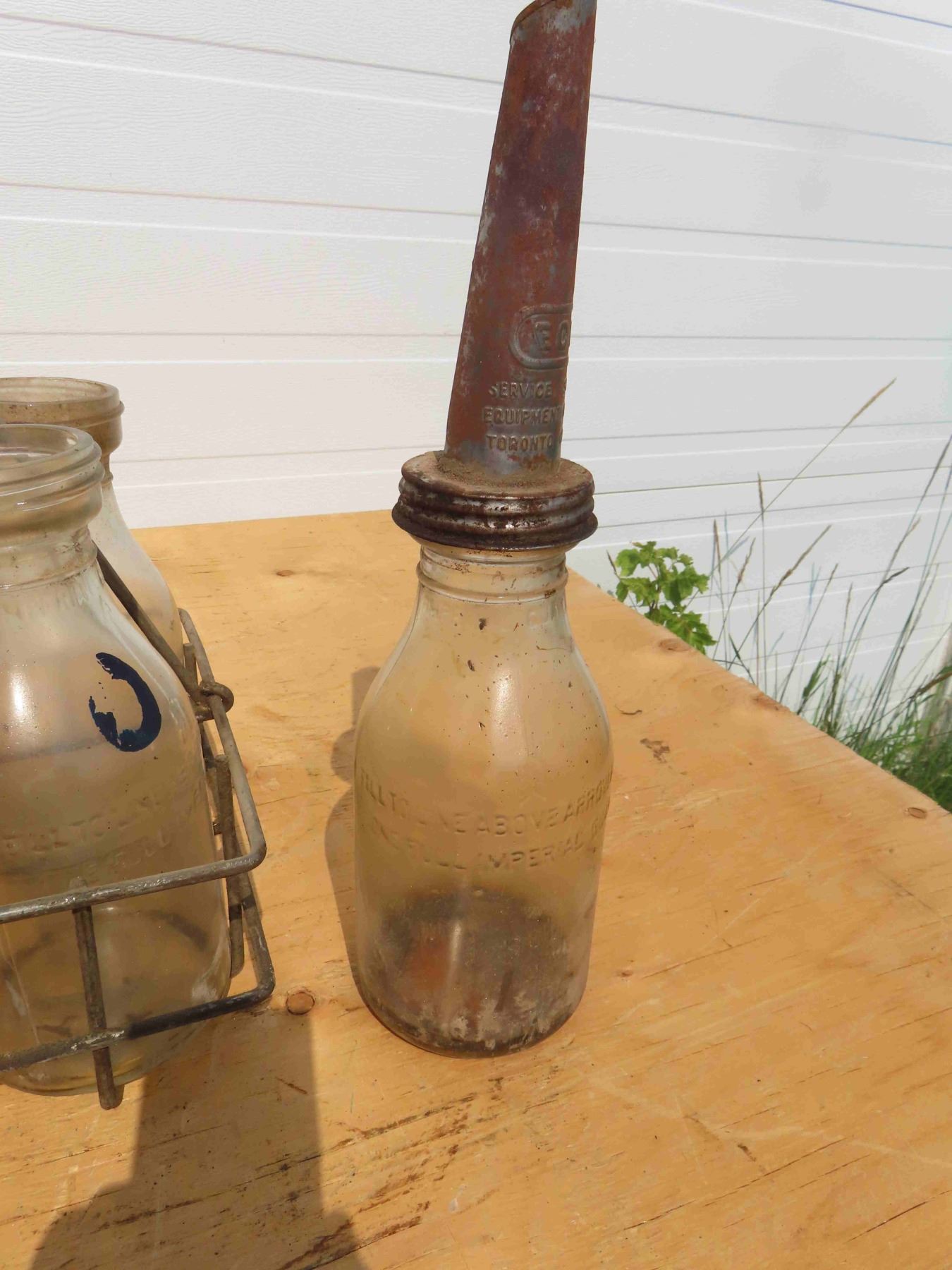 6 Vintage 1 Quart Oil Bottles with Metal Carrier , Includes 1 Spout
