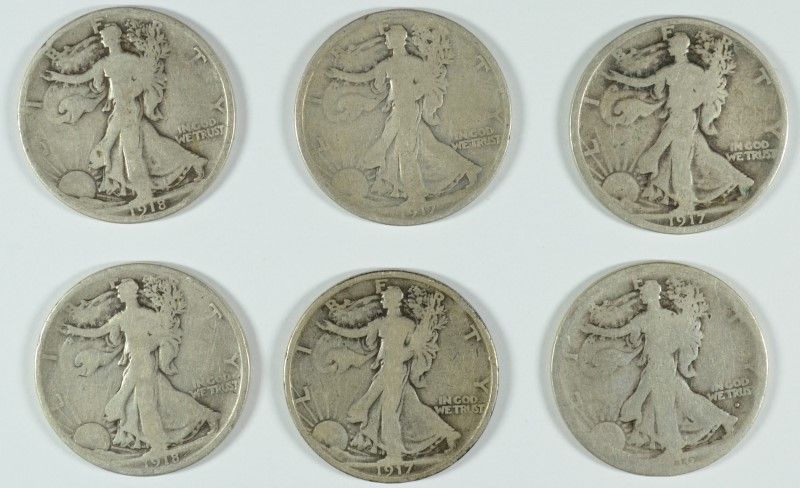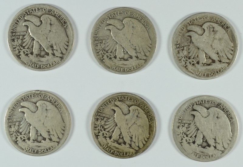 (6) WALKING LIBERTY HALF DOLLARS (16-D, 17, (2) 17-S REV, 18-D, 18-S)