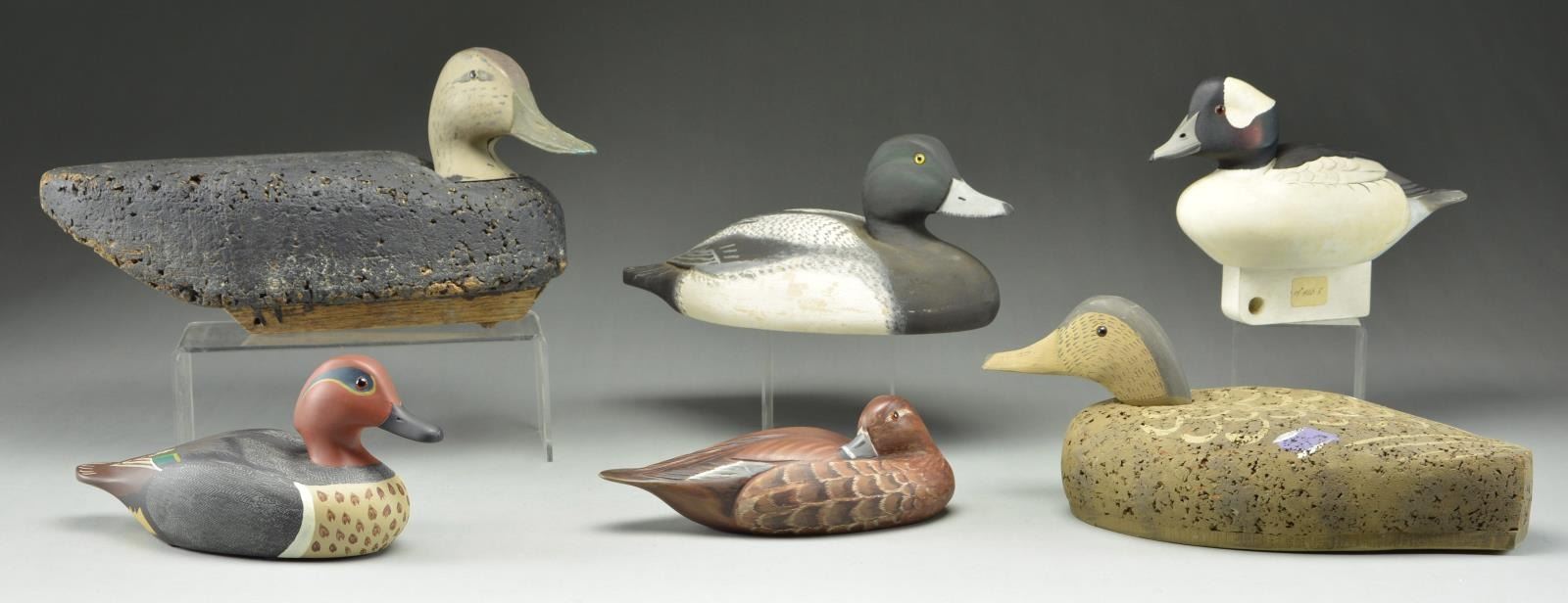 6) WYSOWSKI BROTHERS WOODUCK Overall: 11". Height: 6". Base has 4 felt pads & labeled marked "Made by Wysowski Brothers / Westbrook Conn. Early 1960s. / Original paint by Joe Filanowski / of Stratford, Conn. 1993". CONDITION: very good. PROVENANCE STATEMENT: Estate collection of Thomas F. Wolfinger. (02-18020/MD). $200-300.