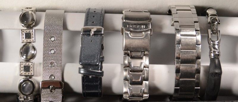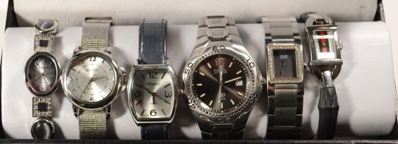 EST $130- $150  All look to be previously worn but nice condition.  MENS Fossil & Citizen Silver Tone, LADIES Gucci, 2- Kessaris & Anriya, most likely needing Battery Replacement