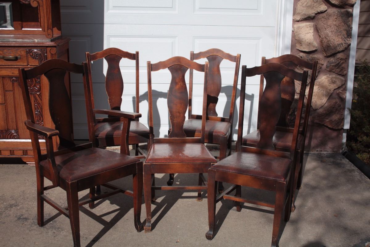 A set of 6 walnut chairs with leather seats from 1940. One chair has arms. (buy one take all)