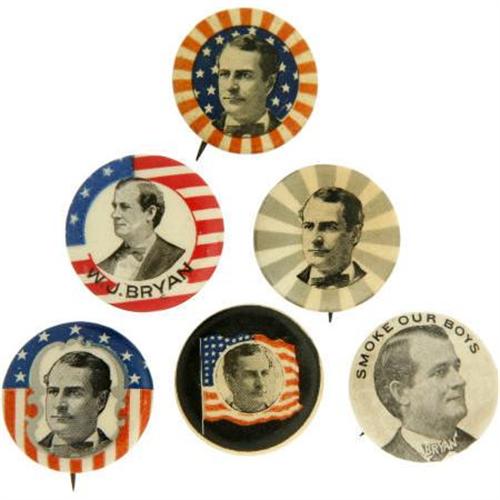 <B>Lot of Six William Jennings Bryan Presidential Campaign Buttons,</B></I> 7/8. Most fine or better. <BR><BR><b>Shipping:</b> Flat Material, Small (<a target="_blank" href="http://www.heritageauctions.com/common/shipping.php">view shipping information</a>)