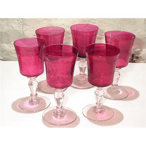 6 Wine?s Glass Cups in Cranberry color. Probably French. In very good conditions, without any chipo or crack. Doesn?t have any sign. Probably 1930. The glass is graved in acid, the foot it?s very well done.