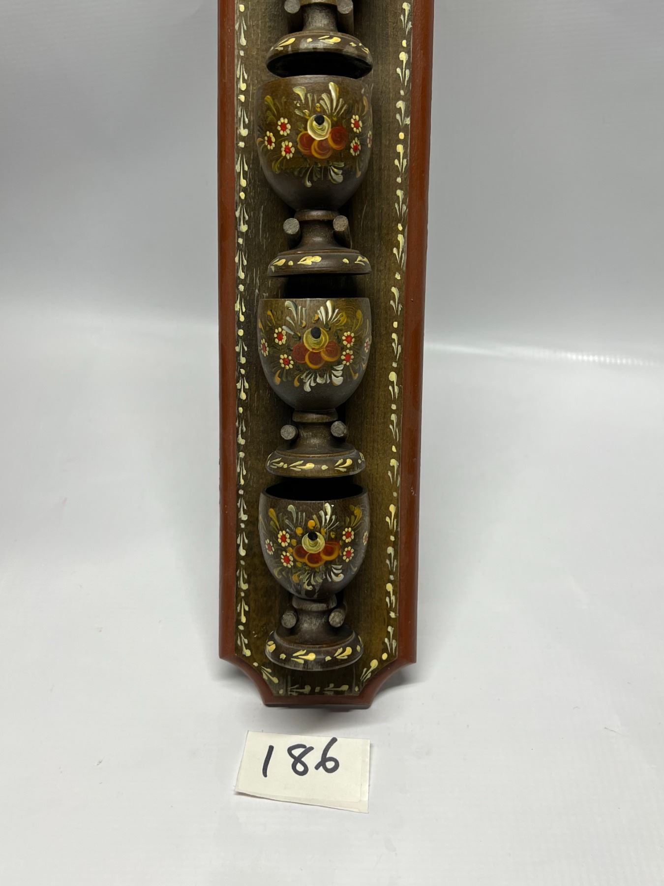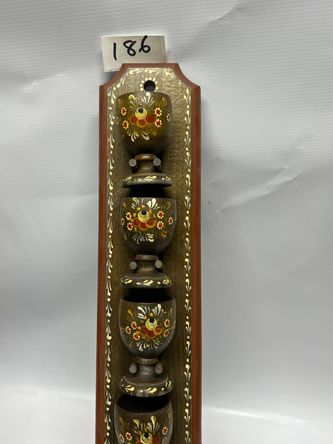 6 Wooden Hand Painted Egg cups w/wall mount holder Appr: 20.5" x 3.5"