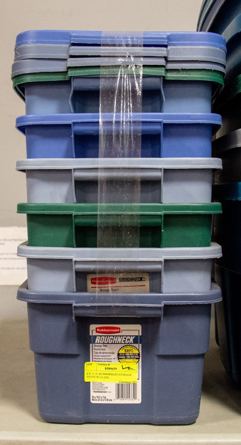 6 X 11.3L RUBBERMAID STORAGE TOTES W/ 4 LIDS
