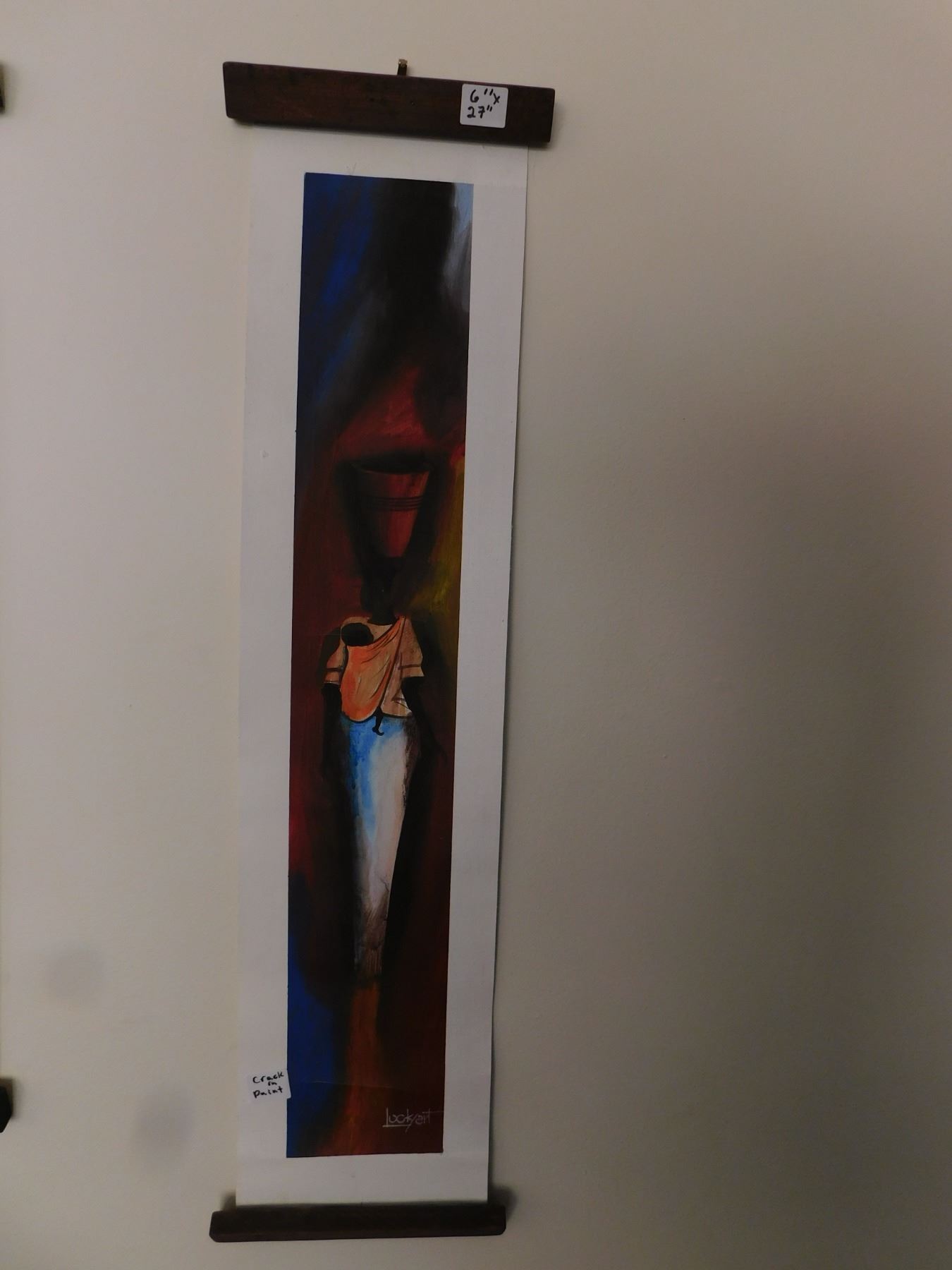 6 X 27” AFRICAN, SIGNED, CANVAS PAINTING, CRACK IN PAINTING