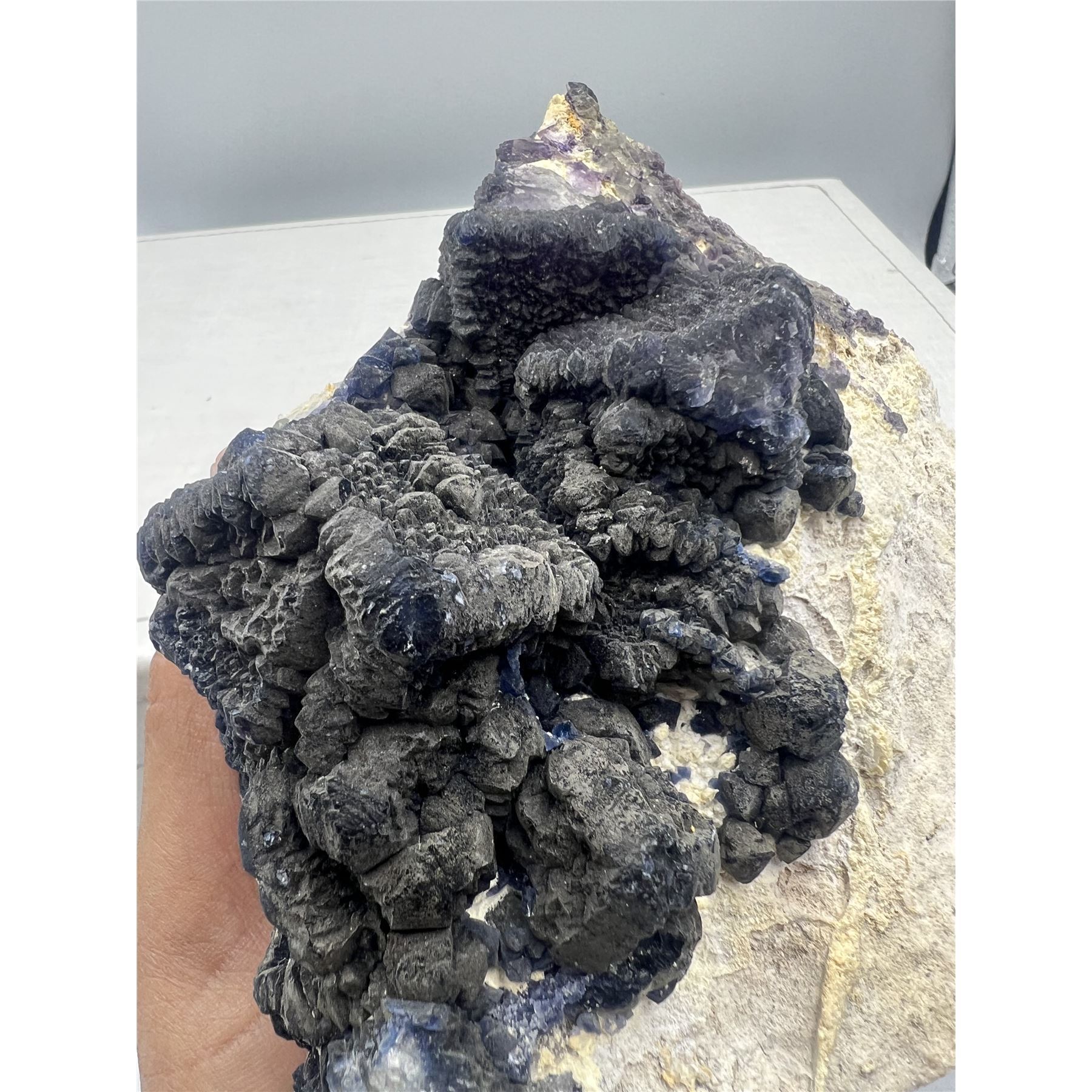 6 X 8 INCH BLUE BERRY FLUORITE SPECIMEN ON STAND