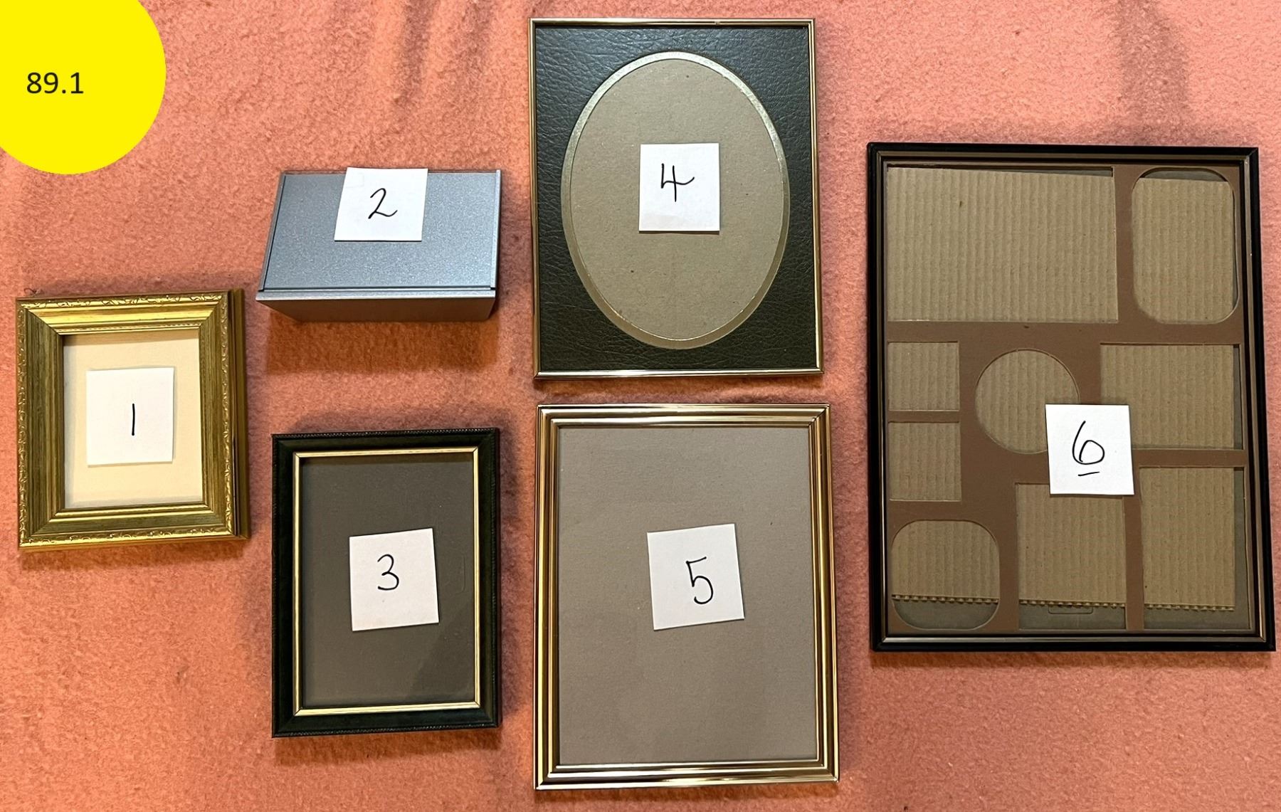 6 assorted picture frames. Dimensions: 7" x 6", 2) 6" x 4.5", 3) 8" x 6", 4) 10" x 8", 5) 10" x 8", 6) 14" x 11" All have glass.