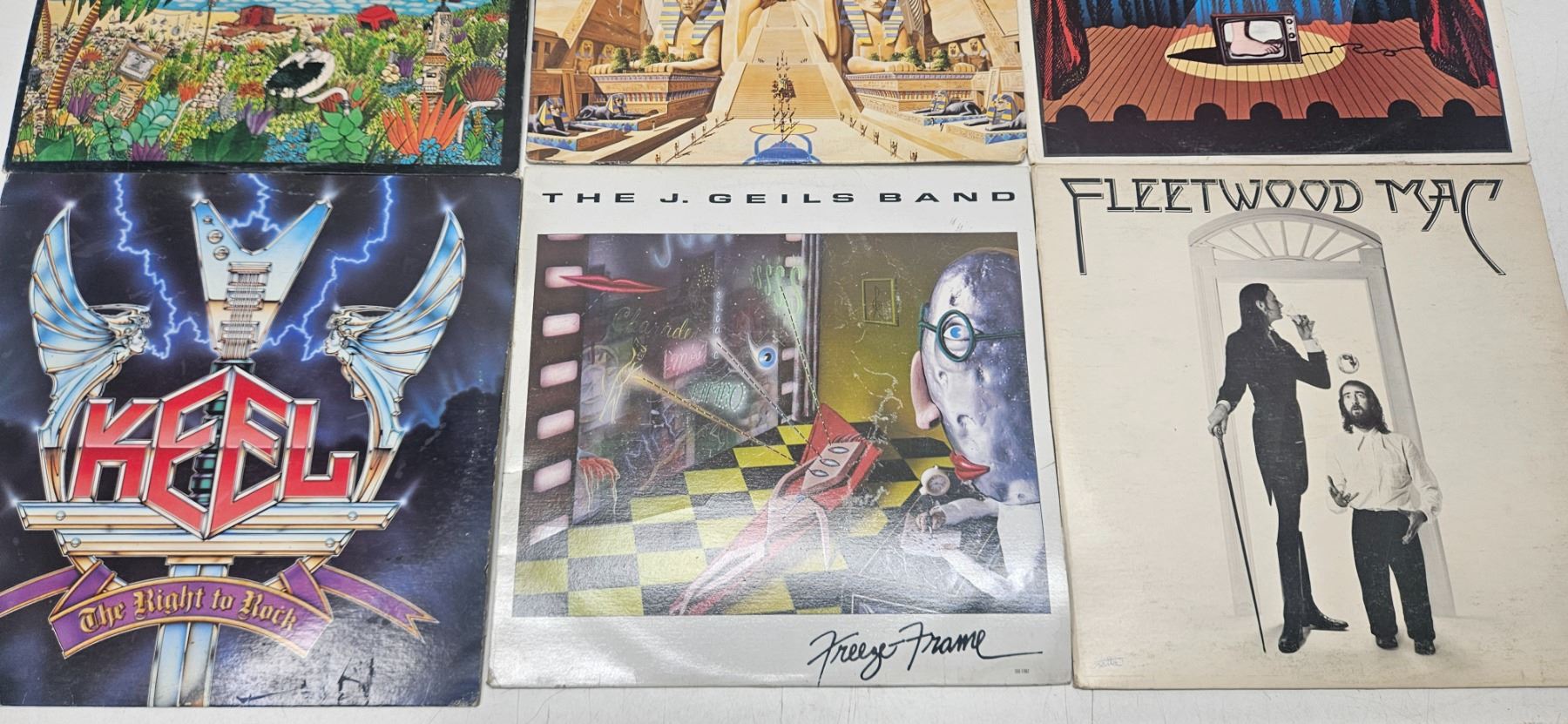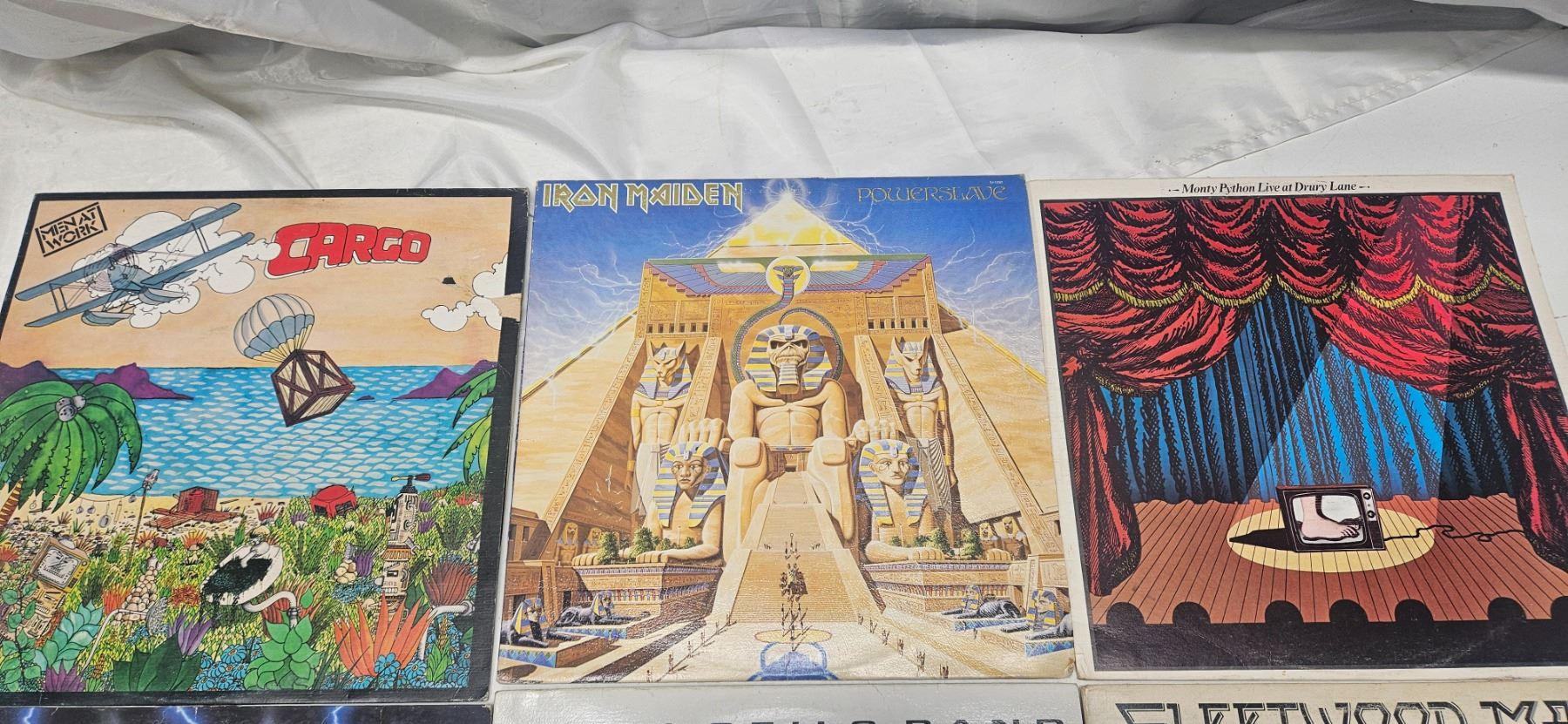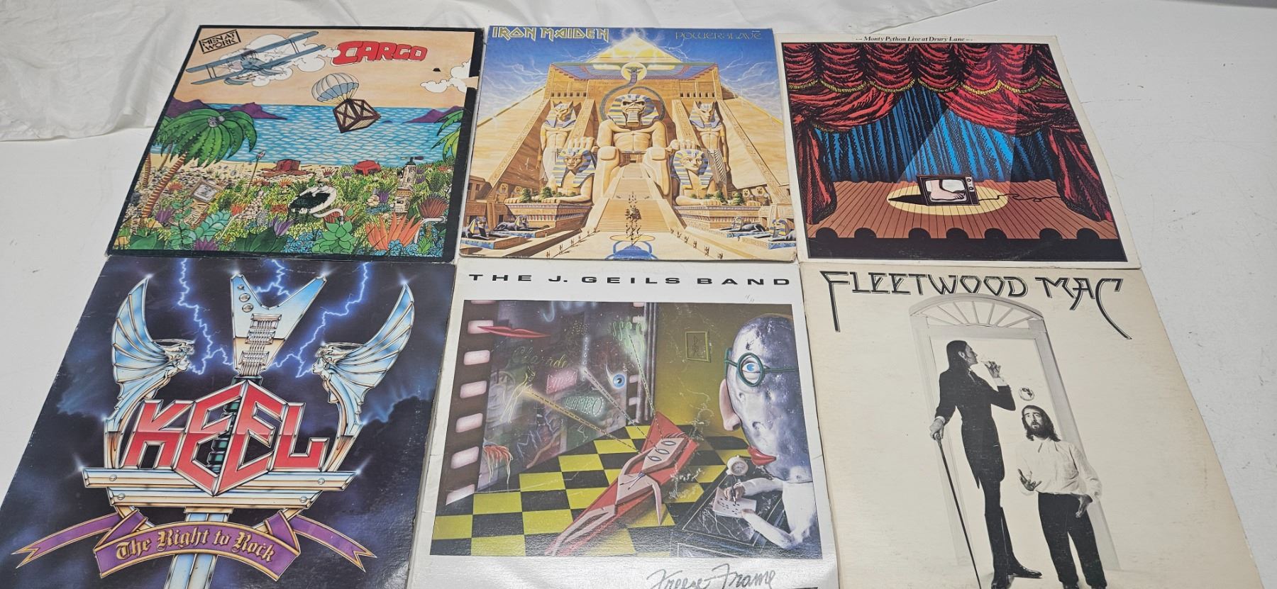 6 assorted record. Iron Maiden, J.Geils band, Monty python live, Fleet Wood Mac, Cargo and Keel
