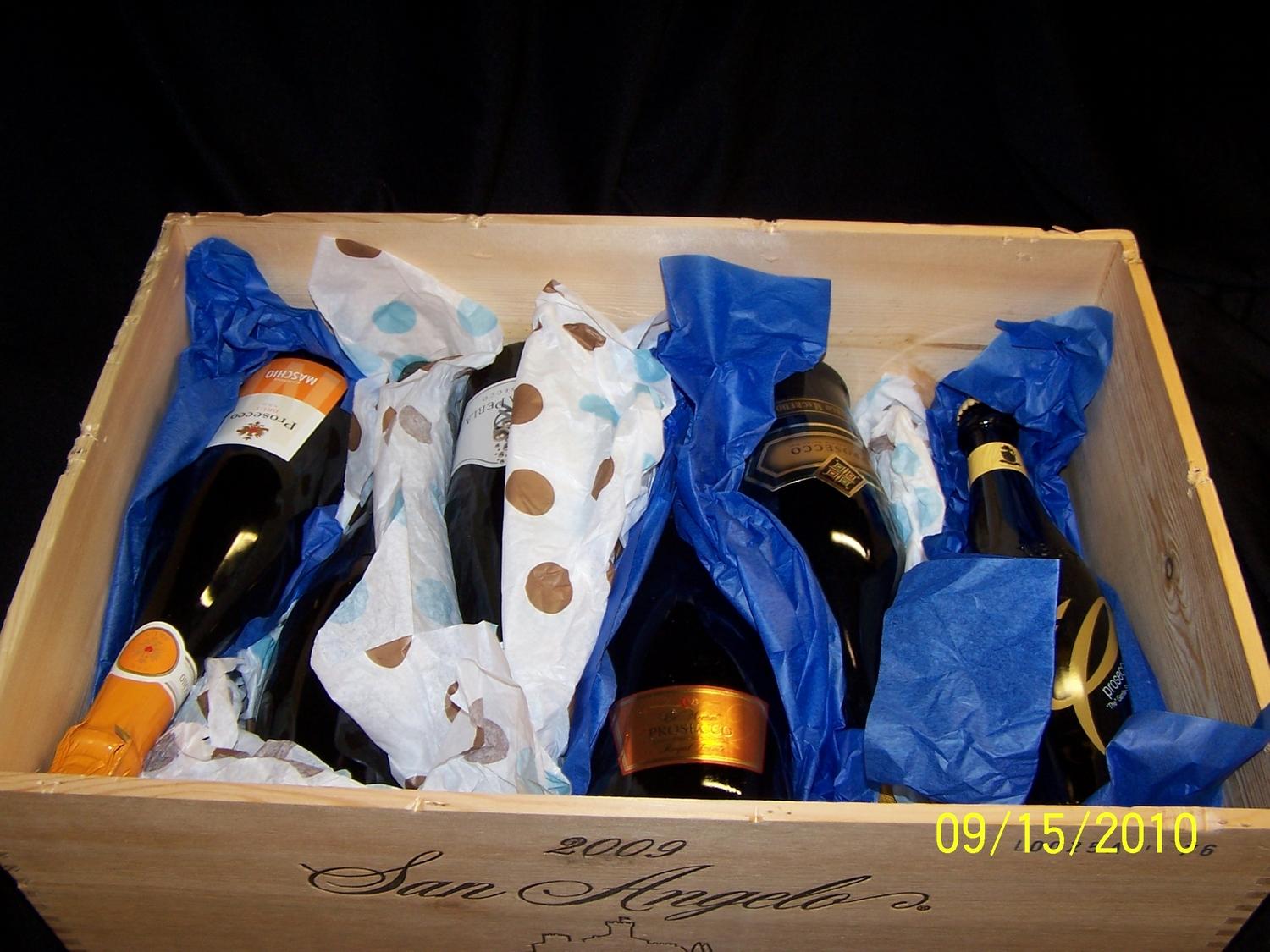 6 bottles of Prosecco from different Italian wineries (sparkling white wine). Donor Kathy Salisbury