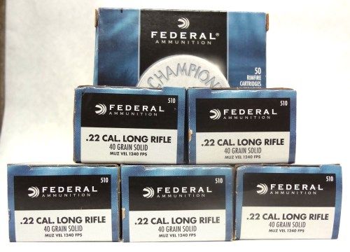 6 boxes of 50 cartridges Federal Ammunition. Campion. .22 Cal. long Rifle. 40 Grain Solid.