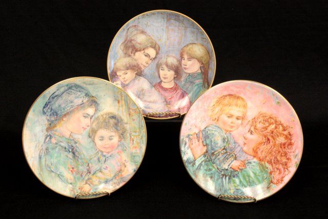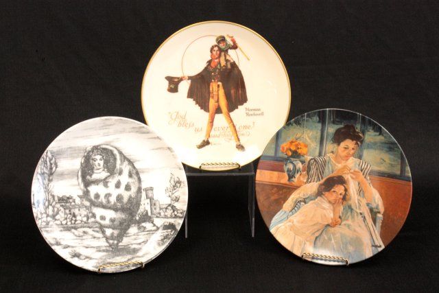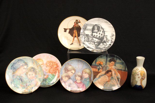 6- Hand painted plates - 5 Edna Hibel, 1 Norman Rockwell, approx. 8.25" Diam. 1- Swedish pottery vase, approx. 8" H. From a Sutton Place, NYC estate. Please read our terms of sale.