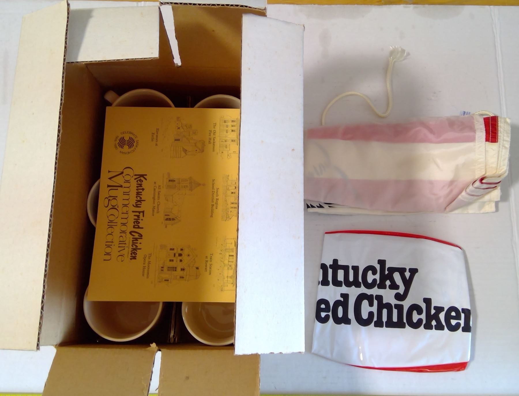 6 commorative KFC mugs, KFC beach ball & Colonel sanders flag