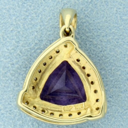 In 10K yellow gold, it is 1 inch long, it contains a 12mm trillion cut amethyst with beautiful color and clarity. Also there are twenty one .01ct round diamonds. 4.8g