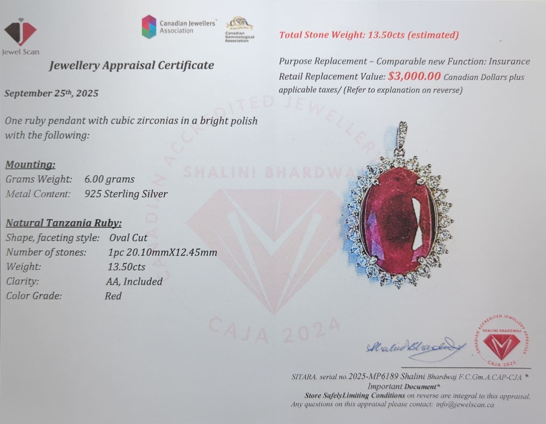 6 ct Certified Silver Ruby gemstone Pendant ($3,000 Appraisal)