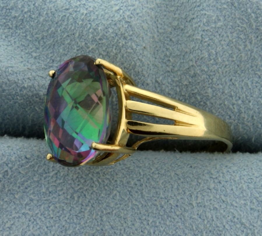 In 14k yellow gold. 6ct Checkerboard cut Oval Mystic Topaz with great color. Size 7. 4.8g.