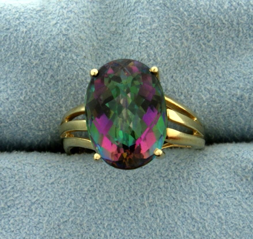 In 14k yellow gold. 6ct Checkerboard cut Oval Mystic Topaz with great color. Size 7. 4.8g.