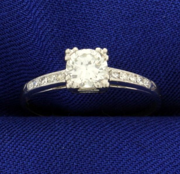 In platinum, Center diamond is a .55 ct high quality round brilliant diamondt with a clarity of VS and a color of H. There are 10 1/2 pt diamonds in shank. Size 7 1/2. 2.1g.