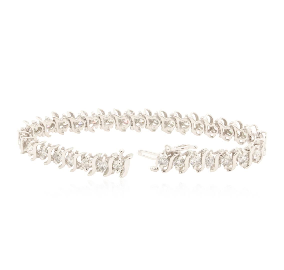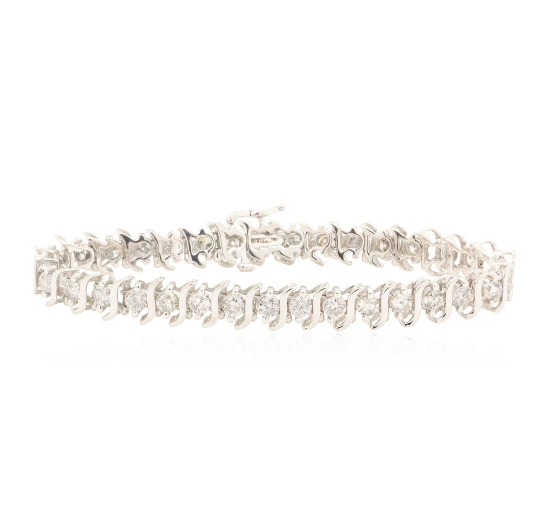 One electronically tested 14KT white gold lady's combination cast & assembled fashion 's' link bracelet with a tongue clasp with foldover safety with a bright polish finish. The featured lady's bracelet measures 7 inches in length. Identified with markings of '14K'. Condition is new, good workmanship. Containing: Thirty-Three prong set round brilliant cut diamonds, measuring 3.70 - 3.60 x 2.27mm (depth est.) approximate total weight of 33 Stones = 6.00ct. Graded in the setting. Color H - J Clarity I-1 to I-2 Cut Good. Total Weight of Diamonds 6.00ct.. Total Weight of Bracelet 18.60gm GAS Appraised at $10605.00. GAS Appraised.