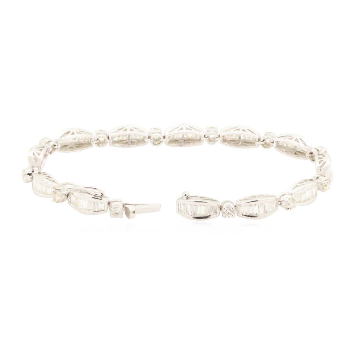 One electronically tested 18KT yellow with rhodium plating gold lady's combination cast & assembled fashion bracelet with a tongue clasp & foldover safety with a bright polish finish. The featured lady's bracelet measures seven inches in length. Condition is new, good workmanship. Containing: Ninety-Two channel set baguette cut (tapered) diamonds, measuring from 2.40 x 1.40 x 1.19mm (depth est.) to 3.10 x 1.60 x 1.37mm (depth est.) approximate total weight of 92 Stones = 4.50ct. Graded in the setting. Color H - J Clarity SI-1 to SI-2 Cut Good Twelve prong set round brilliant cut diamonds, measuring 3.30 - 3.10 x 1.98mm (depth est.) approximate total weight of 12 Stones = 1.50ct. Graded in the setting. Color H - I Clarity VS-2 to SI-2 Cut Good. Total Weight of Diamonds 6.00ct.. Total Weight of Bracelet 17.20gm GAS Appraised at $14715.00. GAS Appraised.