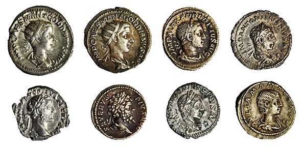 6 denarios y 2 antoninianos: Antonino Pío, Septimio Severo, Heliogábalo (2), Alejandro Severo, Julia Mamaea y Gordiano III (2 antoninianos). MBC/MBC+.