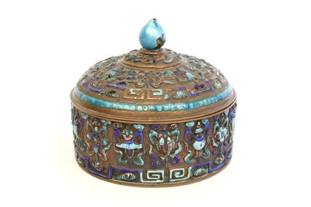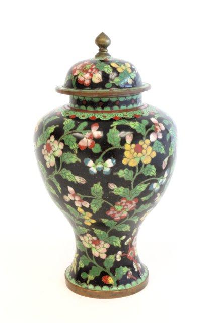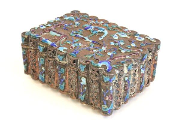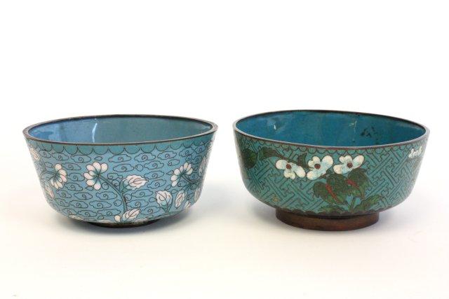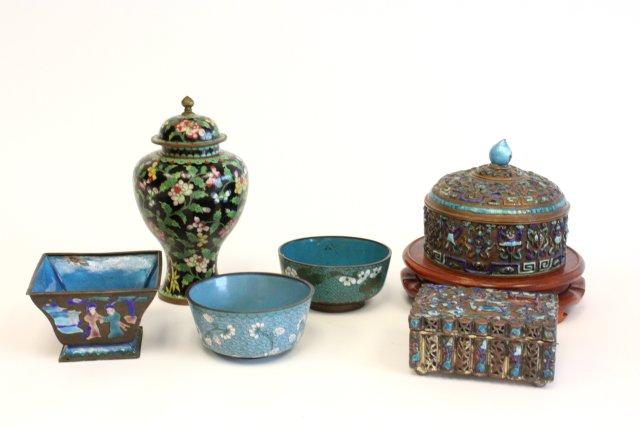 Including: 1- Box with "Bird & Deer", approx. 3 1/8" x 4.5" x 2". 1- Planter with interior damage, approx. 4" x 8". 1- Round box with damage to lid. 1- Cloisonne ginger jar, approx. 8". 2- Bowls with damage, approx. 5" x 2".