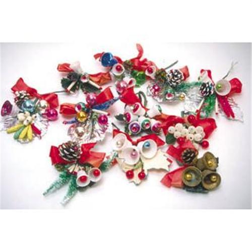 c1950s, set of SIX assorted Christmas corsages --wear them, decorate with them, use them as gift wrap, or attach them to a Christmas reef! Delicate clusters of glass bulbs, pine cones, silk ribbons, leaves, bells, balls, bows, candy canes, tiny candles, etc. form these wonderful corsages, sizes vary in the 3? to 4? range. Each different in the set of 6.
