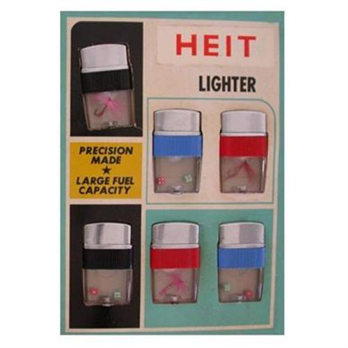 Six clear-view lighters, 3 with mininature dice and 3 with a fishing hook inside, all on original store display measuring 7" x 10", made in Japan.