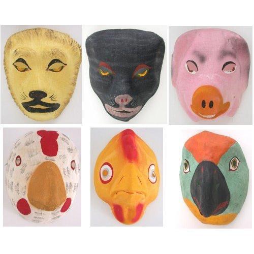 Gauze Halloween masks featuring six different animals, each with hand painted detailing, circa 1940s. These are oversize and quite imposing, designed for older children or adults. They are stiff gauze made in high bas relief and truly beautiful! The largest of this group is 10? tall.