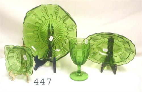 6 pc. Green pattern glass – goblet, 3 berry bowls (chips), 9” oval bow (chips), rolled edge plate.