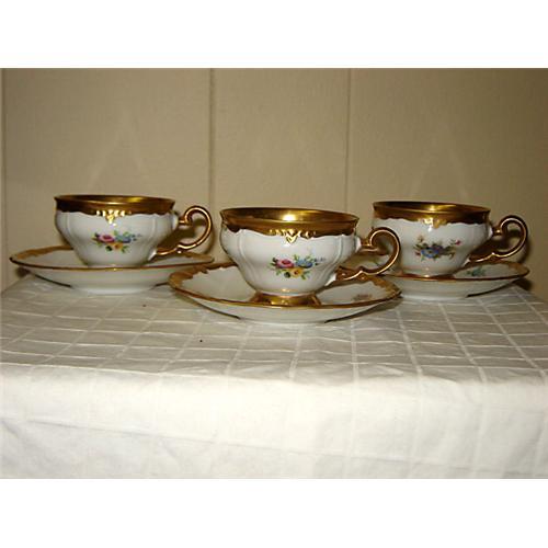 This is a gorgeous vintage demitasse tea set for 3 made by the Royal Porcelain Manuf.Co. of E. Germany.