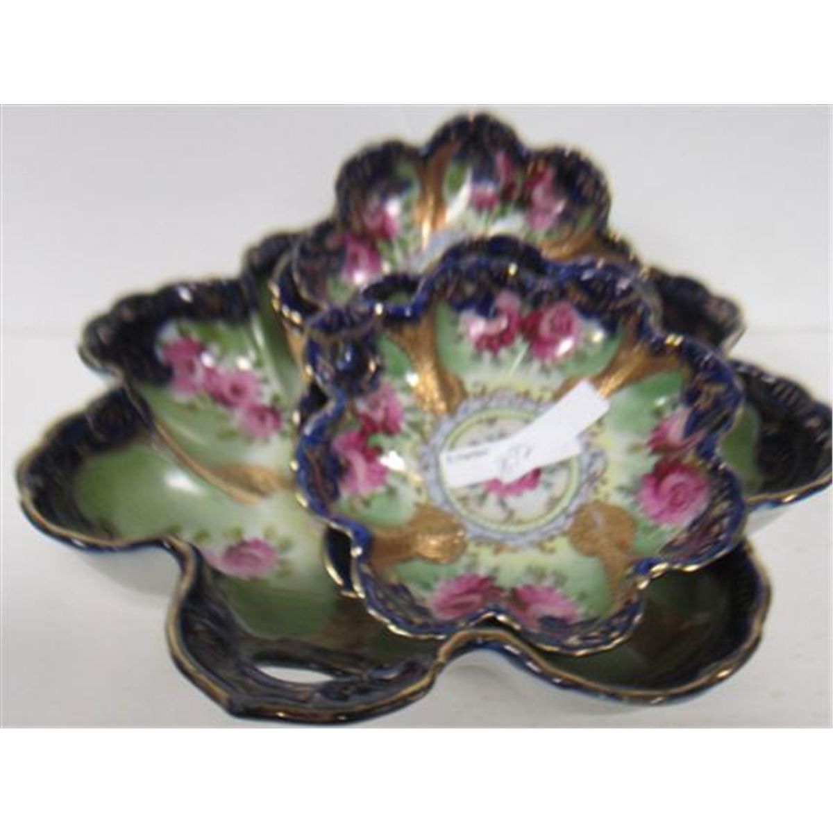 6 piece berry set unmarked Austrian- gold trim with cobalt blue and flowers-scalloped-5-11 inch