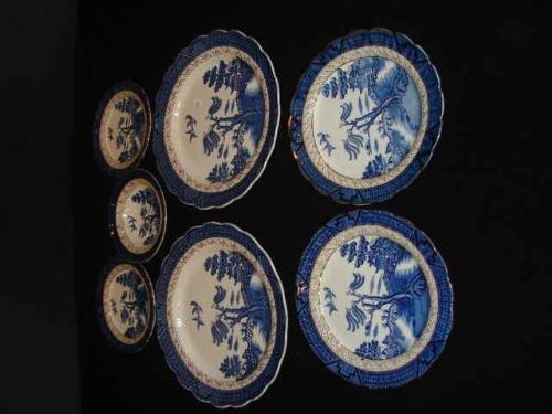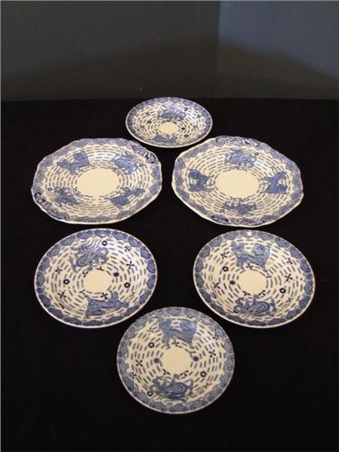 6 pieces china, Late Spode, Burn's Pattern, Blue and White Dragon and Griffin Design, manufactured Livingstone's China, Oban, by W.T. Copeland & Sons. 2 - 10" dinner plates, 3 - 7 1/2" sandwich plates, 1 - 6 1/2" bread plate.