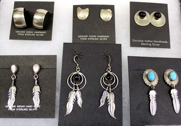 6 pr Navajo Sterling Pierced Earrings on Cards ready to sell. Liquidation of California Native American Jewelry Business. Longest earrings Measure approx. 2''L including the turquoise, onyx with feathers & mop. Total weight 28.57gr