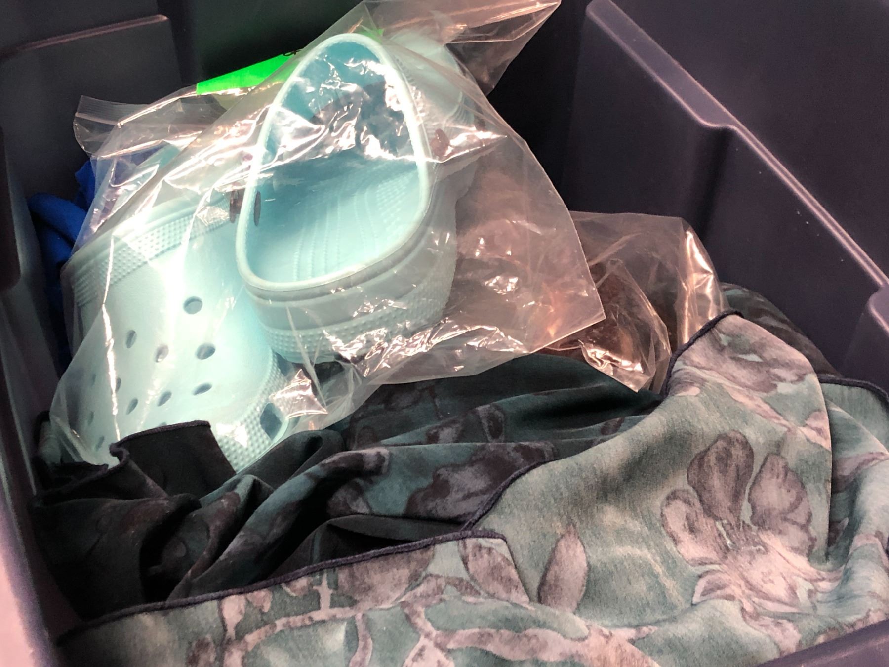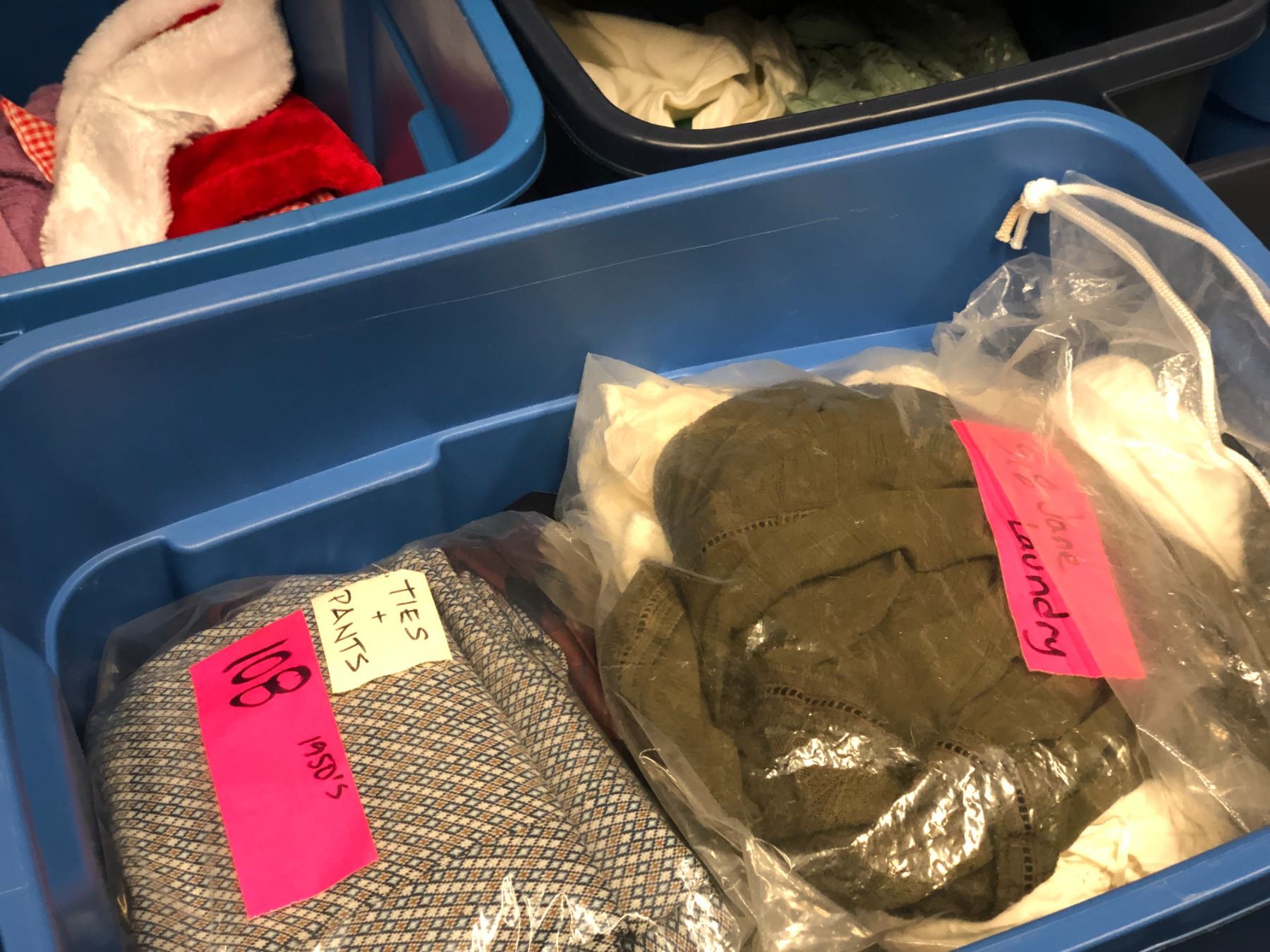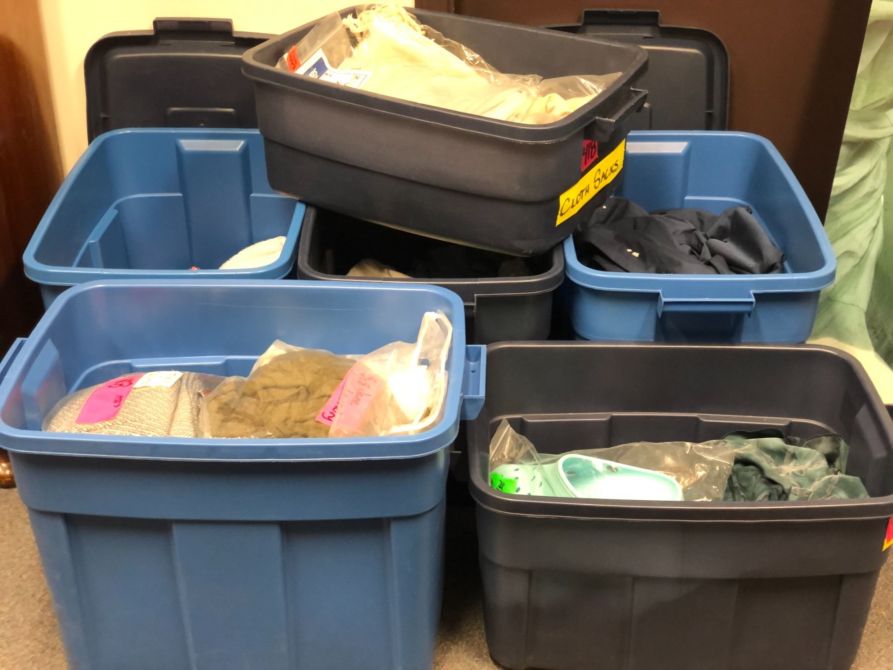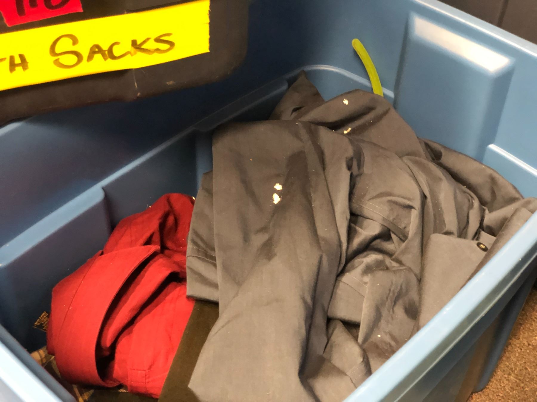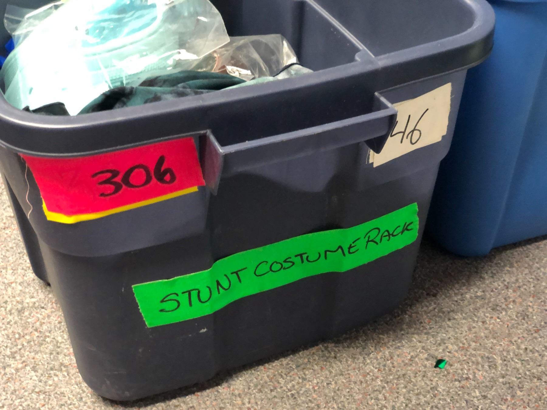 6 rubber made containers of assorted actors / stunt / extras clothing & clothing pcs. (From the superhero show)