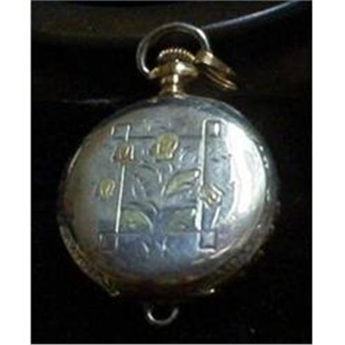 This coin silver ladies 6 size open face pocket watch has some nice multi gold detail on the cover. Watch is in working order, has a 7 jewel movement, and was made in 1895. Dial has a pretty porcelaine dial.