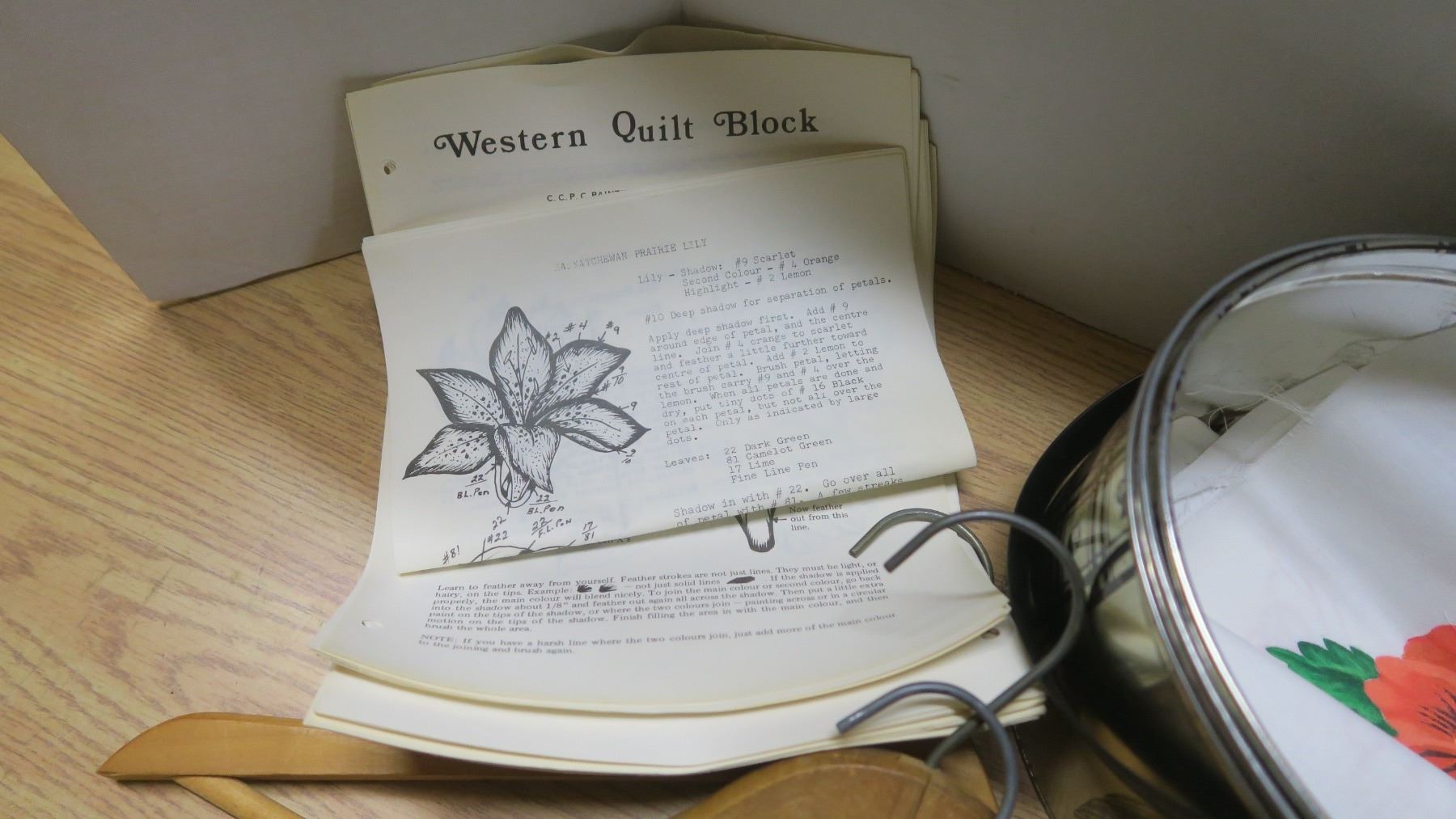 6 wooden clothes hangers, tin of unfinished needlework/patterns