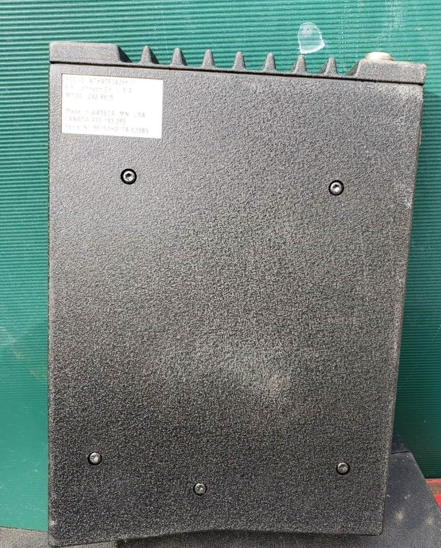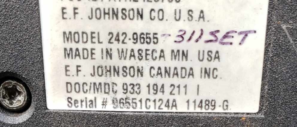 EF Johnson 242-9655 800 mHz. LTR Trunking mobile radio. With channel display, push buttons: Pwr, V, A, S, Dcan, Menu, Home Channel, Rocker controls: Vol, Sys, Group and built in speaker.