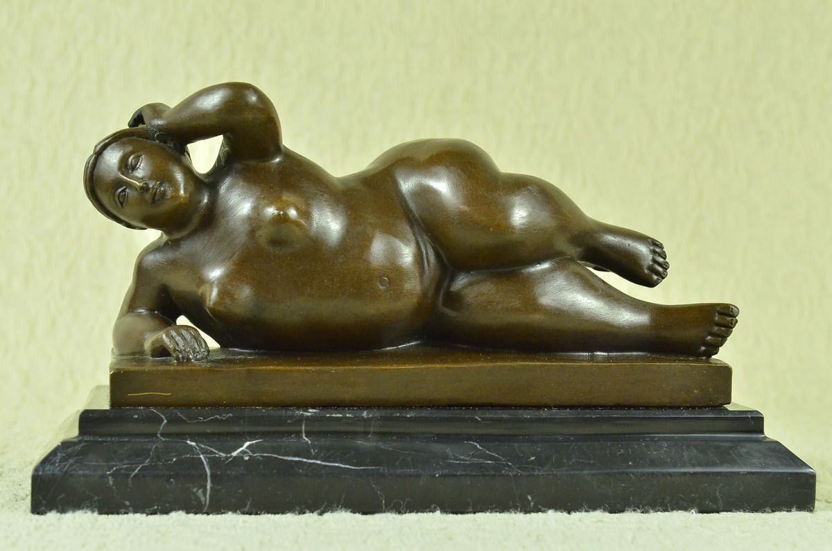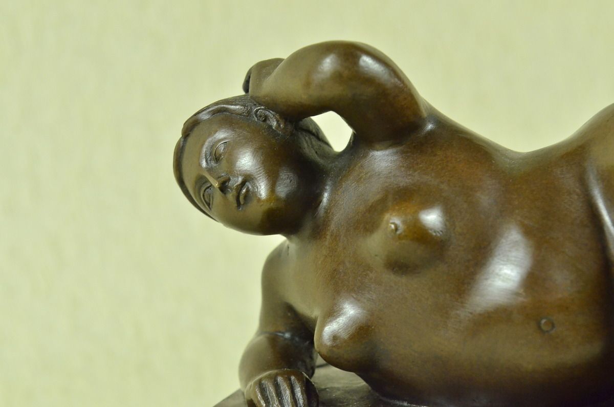 11DS41480 True To The Artist Botero'S Abstract And Representational Style, The Woman Is Proportionally Exaggerated, Giving A Defined Plumpness To Every Part Of Her Form. The Pleasantly Full-Figured Lady Lays On Her Side Both Calm And Relaxed. A Sense Of Peace And Happiness Runs Across Her Smile. Her Right Arms Hangs Under Her Body. Her Left Arm Hides Behind Her Head As If She Were Posing For The Beholder. She Was Created Using The Lost-Wax Method Of Casting. This Technique Allows The Molten Precious Metal To Mold To The Smallest Detail Of The Artists Cast. Fantastic Detail Is Seen In The Folds Of Skin On Her Stomach, Neck And Mouth. The 100% Bronze Sculpture With A Brown Patina Finish Is Mounted Upon A Black Marble Base With The Signature Of Botero. Fernando Botero Angulo (Born April 19, 1932) Is A Colombian Figurative Artist, Self-Titled "The Most Colombian Of Colombian Artists" Early On. He Came To National Prominence When He Won The First Prize At The Salón De Artistas Colombianos In 1958. Working Most Of The Year In Paris, In The Last Three Decades He Has Achieved International Recognition For His Paintings, Drawings And Sculpture, With Exhibitions Across The World.[1] His Art Is Collected By Major Museums, Corporations And Private Collectors..................SHIPPING USA: $20....HI, ALASKA, CANADA: $49...ALL OTHER COUNTRIES: $89