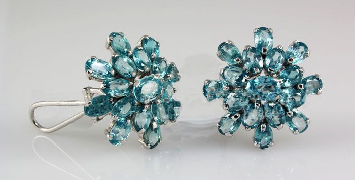 60.05CTW Flower Blue Zircon Cluster Silver Earring **|**|** Sky Blue Zircon Gemstone in Flower Design Silver Earring w/ Clipon Back; small 6x4mm*center 7x5mm; ctw: 26.90; stone count: 34; gram weight: 6.63 ; MSRP: $2600