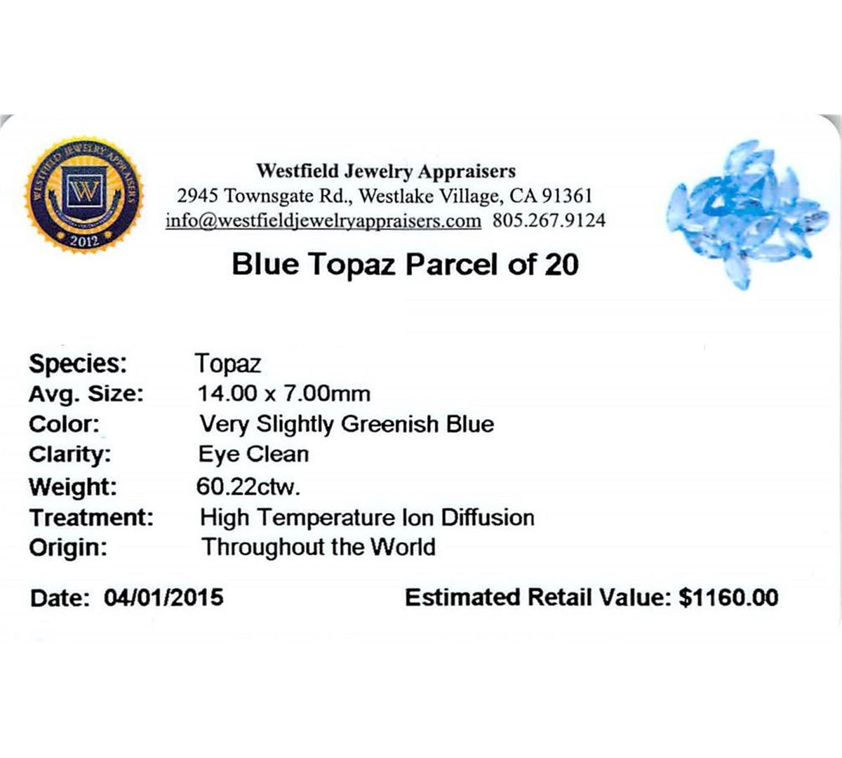 Twenty marquise mixed cut natural blue topazs exact total weight 60.22ct., clarity is eye clean, type I, medium dark, moderately strong, very slightly greenish blue color, (GIA vslgB 6/4), cut is good. Westfield Appraised at $1,160.00.