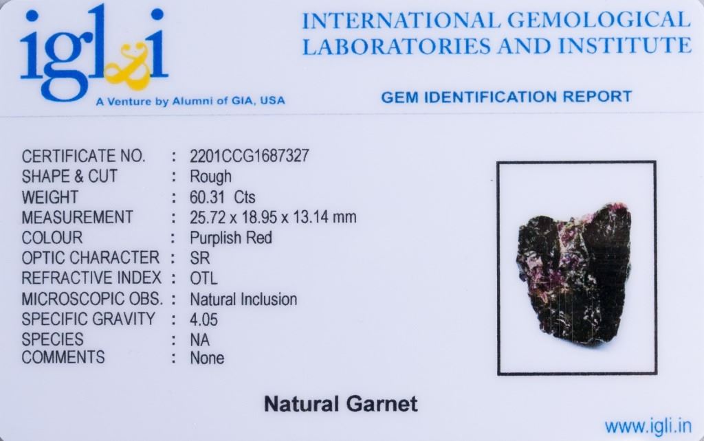 60.31 ct rough natural garnet. Accompanied with IGL&I certificate. 25.72 x 18.95 x 13.14 mm.