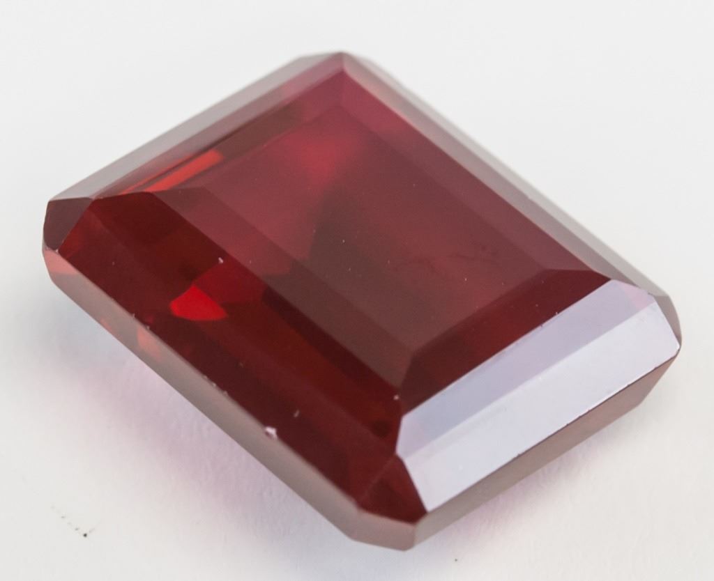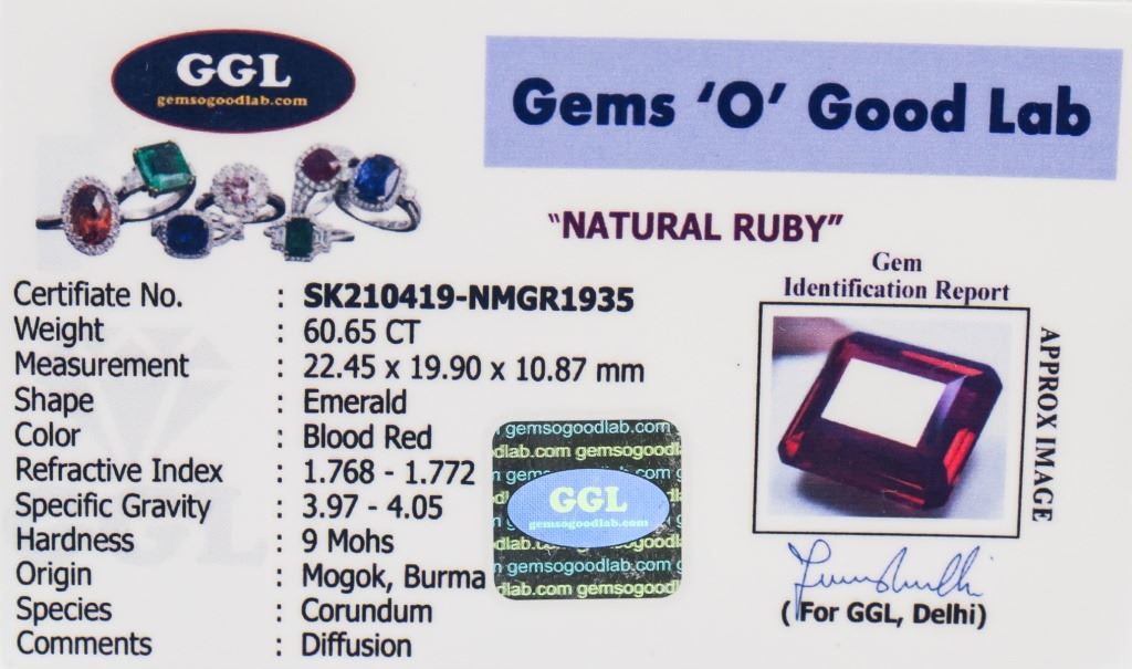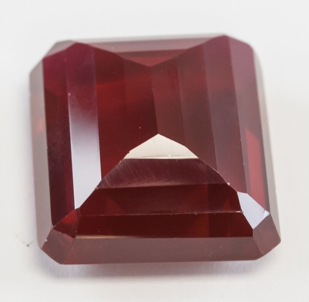 60.65 ct emerald cut blood red "NATURAL RUBY". Origin: Sri Lanka. Accompanied with a GGL certificate. 22.45 x 19.90 x 10.87 mm
