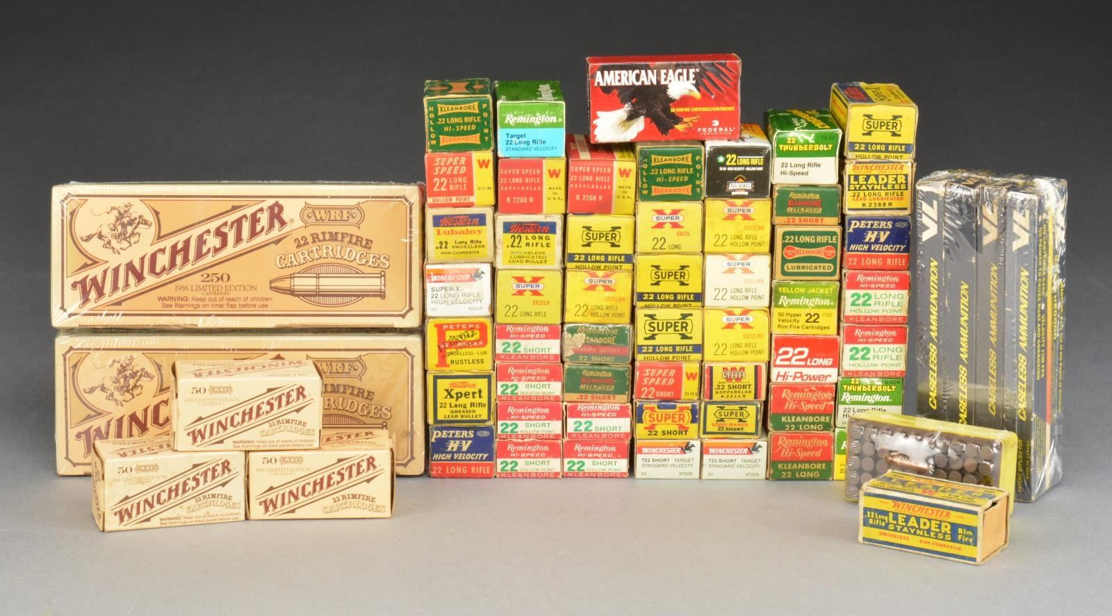 LOT CONTAINS HOLLOW POINTS. All boxes are full unless noted. 12 - 50 RD. BOXES 22 SHORT. Makers include Rem., Win. & Western. 4 Boxes contain hollow point bullets. 3 PARTIAL BOXES 22 SHORT. 1 Rem. Hollow points, 1 Empty Rem. & 1 Win. 5 BOXES 22 LONG. 1 Unmarked box containing 50 rds. / 4 - 50 rd. boxes: 1 full Federal, 2 Partial Rem. & 1 full Western Super X. 24 - 50 RD. BOXES OF 22 LR. Notable examples: 1 Aguila Sniper Subsonic. / 1 Unmarked plastic block 22 Blanks. / 1 Win. Leader Staynless w/ 1 torn & open corner. / 1 Rem-UMC Kleanbore lubricated. / 1 Western 40 gr. lead. Box has moderately worn & stained appearance w/ ammo having patina. / 12 PARTIAL 50 RD. BOXES 22 LR. Balance more than half full. Notable examples: 1 Rem. Target Standard Velocity. / 2 Rem. Dupont Hi-Speed hollow points. / 1 Rem-UMC Kleanbore. Box has tears separated edges w/ missing end flaps. / 1 Peters Rustless. Box is heavily stained missing 1 end flap. / MISC: 1 Partial 9 rd. box of 22 LR SHOT in plastic case. / 4 - 100 Rd. boxes of 22 VL caseless. 1 Box has missing end flap. /(3- 50 Rd. boxes & 2 sealed Cases containing 5 - 50 rd. boxes of Winchester 1986 Limited Edition 22 WMR. / 2 Packages of strip cap along w/ 1 Super Band die cast metal Luger mini cap gun. CNODITION: balance of boxes have light to moderate wear, staining & tears. (02-14675-4/RW). $200-400.
