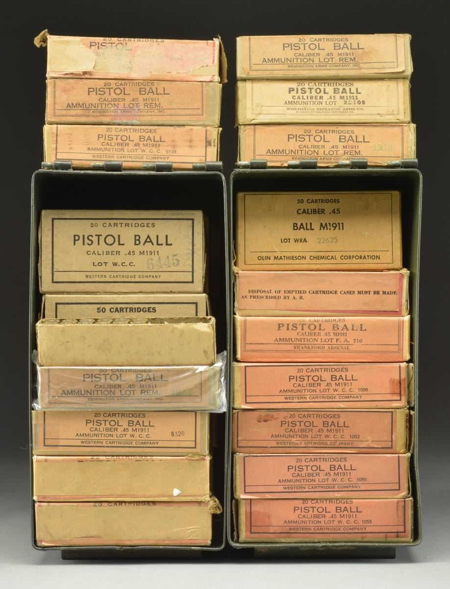 20 RD. BOXES (SEALED UNLESS NOTED). 5 BOXES Interwar Frankford Arsenal Bulls Eye No. 2, lots in 300's series. / 1 BOX Interwar Frankford Arsenal No. 5 Lot 388. / 2 BOXES Interwar Frankford Arsenal Bulls Eye, No. 2, Lot 400's series. / 2 BOXES Interwar Frankford Arsenal No. 5 Lot 400's series. / 6 BOXES Interwar Frankford Arsenal Lot series 584 & 533. / 6 BOXES Frankford Arsenal Lot series 710 & 719. / 1 BOX Frankford Arsenal missing label. / 4 BOXES WWII Western Lot 1,000's series. / 2 BOXES WWII Western Lot 6000's series / 4 BOXES WWII Remington. / 1 OPENED BOX Rem. w/ label loose around box. / 1 BOX Win. Lot 22105. / 6 BOXES Sealed w/ brown painter's tape over the exterior covering markings. / 1 PARTIAL BOX of 10+ Rds. missing label & cover. / Lot includes 2 ammo cans. CONDITION: some boxes are shrink wrapped. Some boxes exhibit ink stamped retailer's or collector's marks. While most labels are sealed, boxes around labels are tearing, side panels are separating & showing wear commensurate w/ age. (02-17436-9/MD). $450-700.